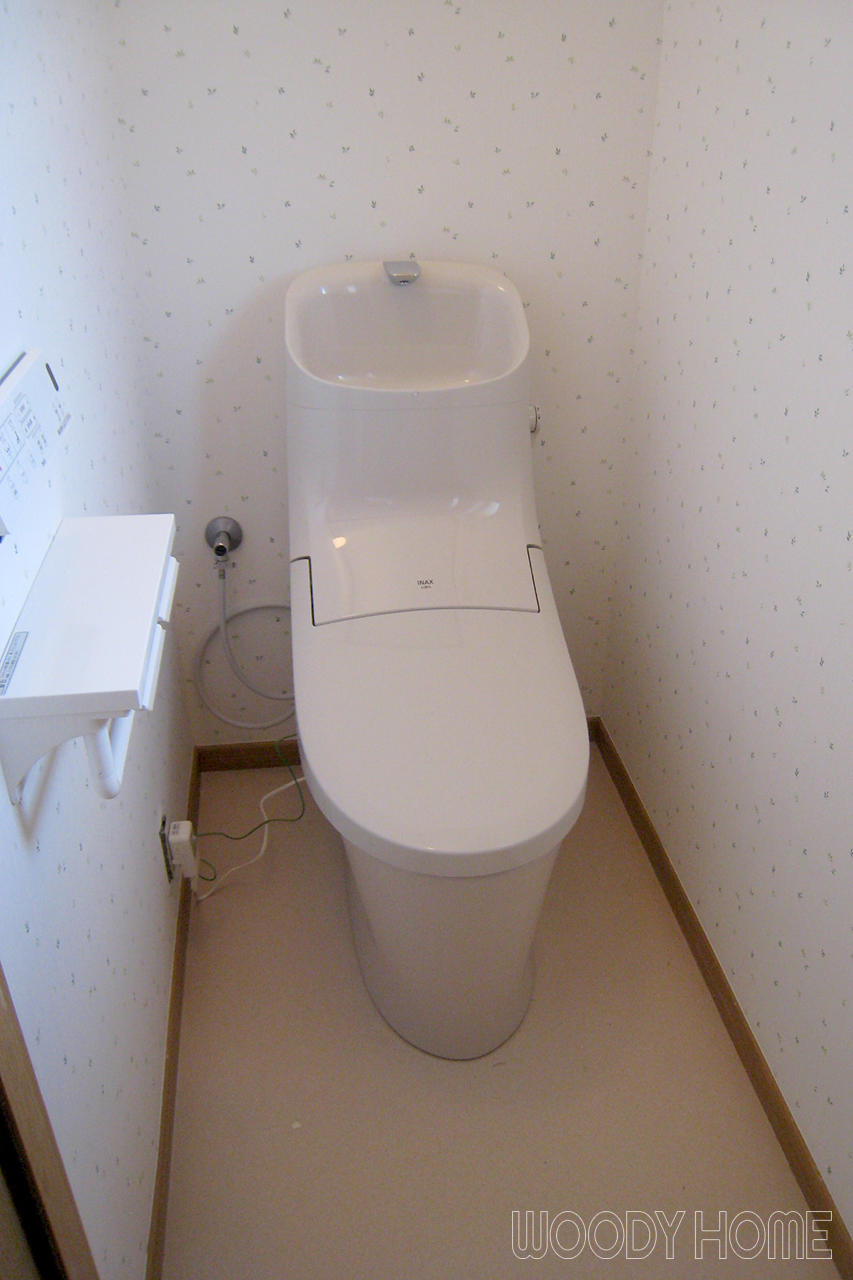 トイレはアメージュZA。タンク上の手洗いボウルが深めなので手洗い時の水跳ねによる床の汚れが少なくなります。