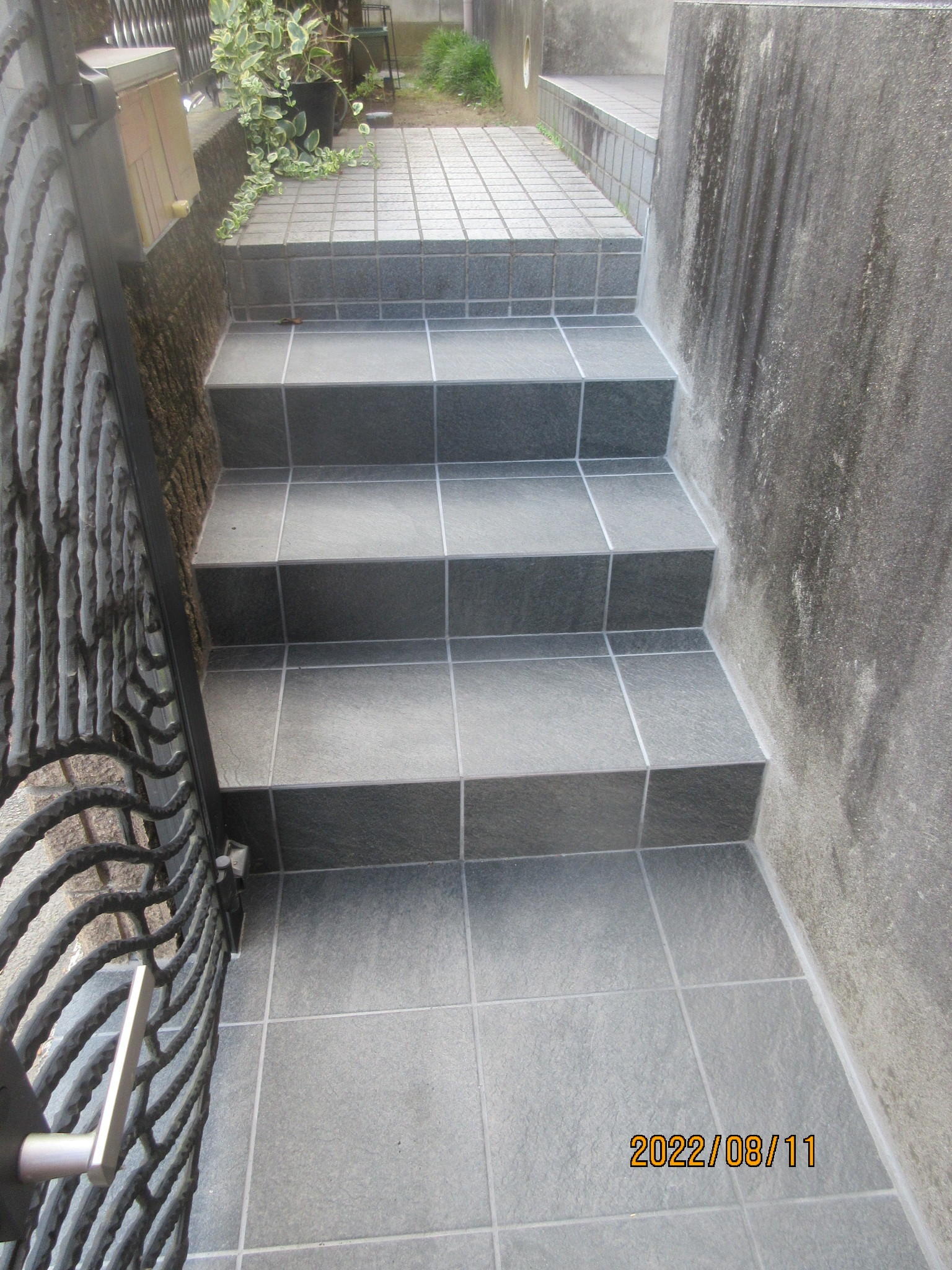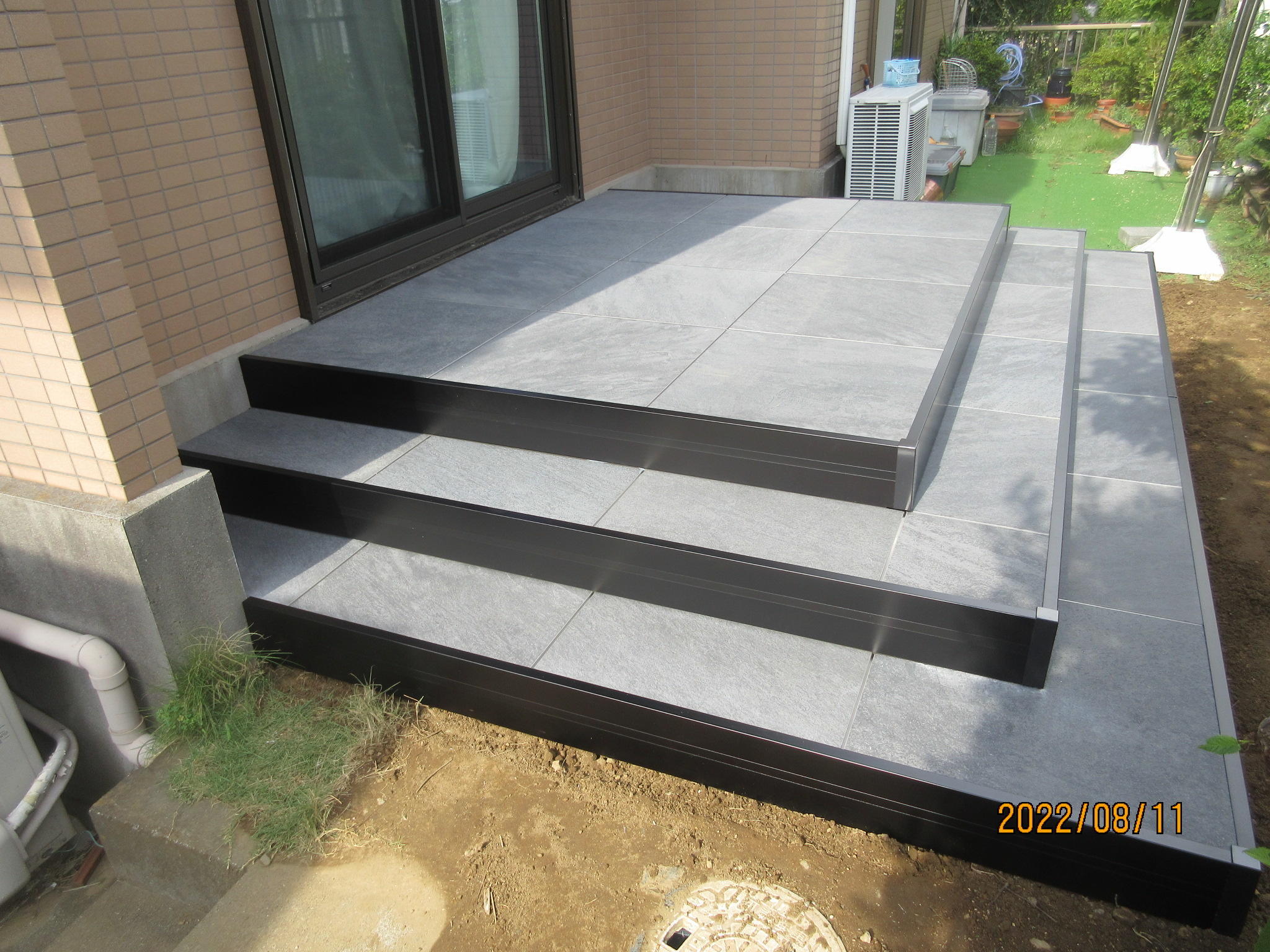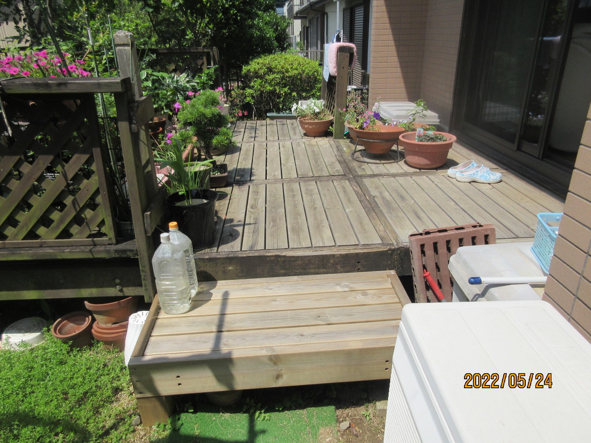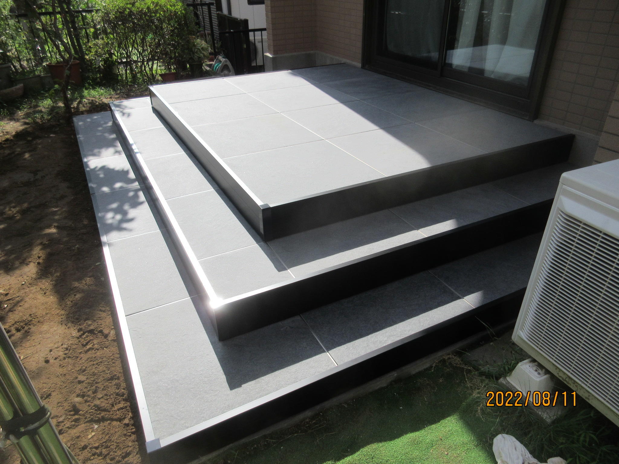 ウッドデッキがかなり傷んできたため、年数がたっても傷むことのないタイルデッキで交換。 デッキ廻りも併せて整理してお庭もすっきりしました。 同時に玄関階段のタイルも似た色のタイルを貼り、すっきり美しくなりました。