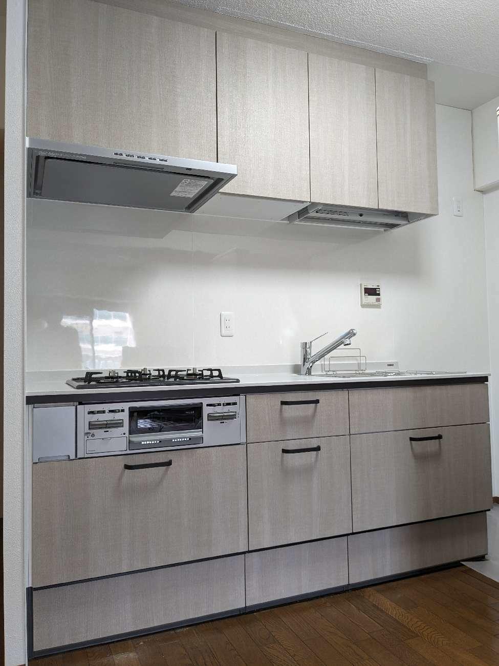 LIXILノクトの商品です。扉の色、取手、天板、キッチンパネル、レンジフード、水栓など全部ご夫婦で拘ってお選びになりました。既存のダイニングの雰囲気に合うとても素敵なキッチンになりました。