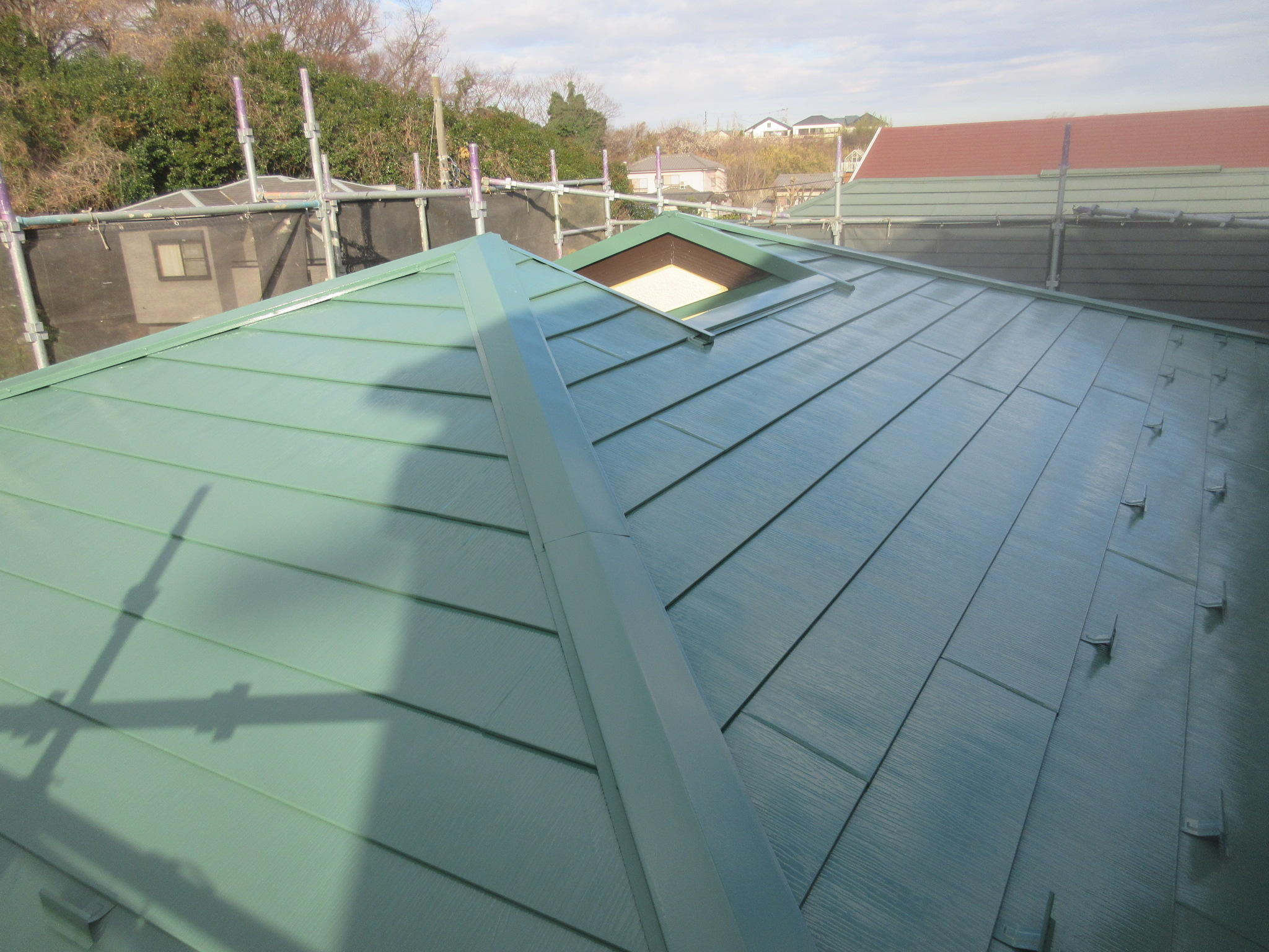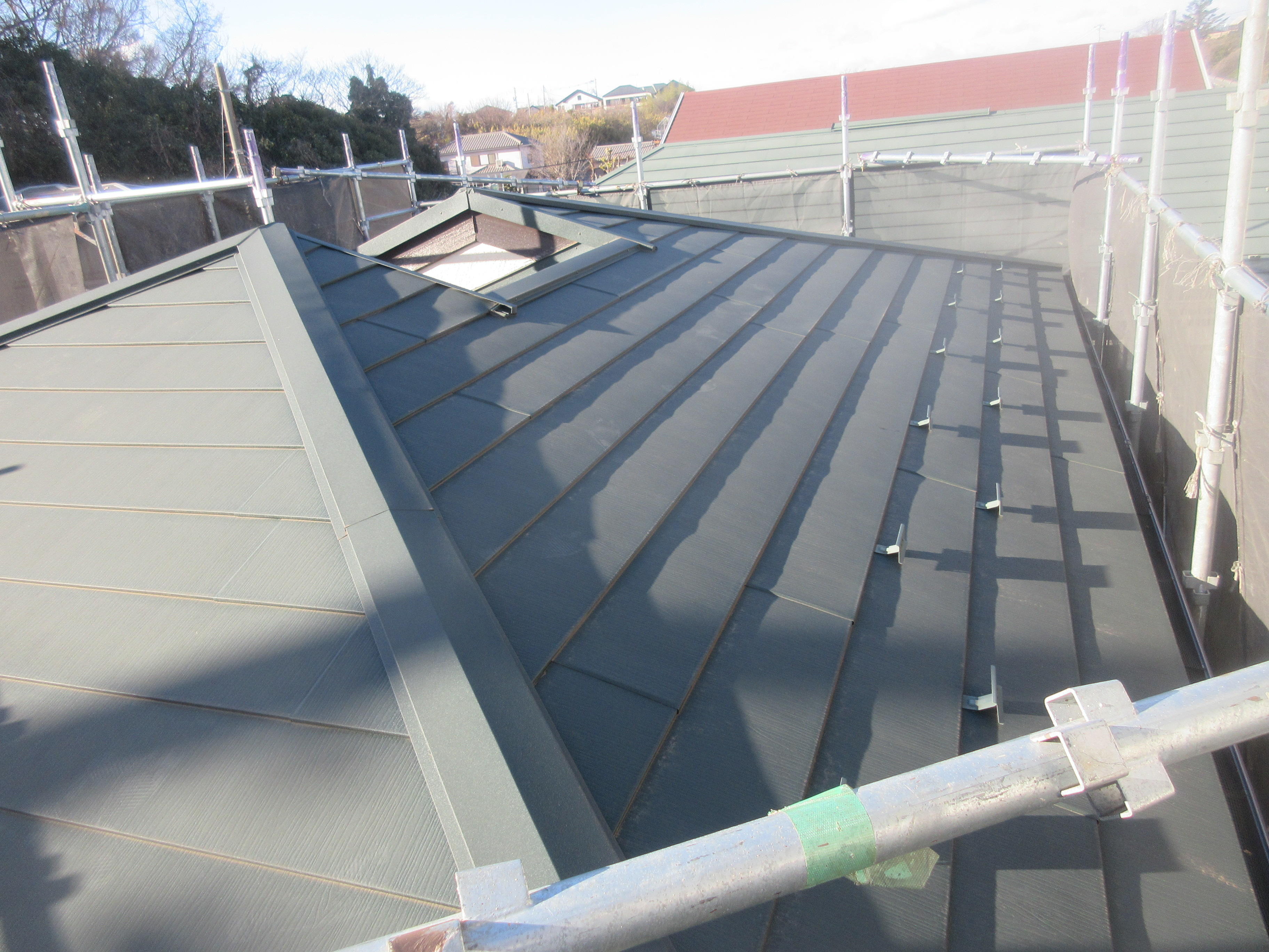 外壁は塗装の時期にきていましたが、屋根は前回カバー工法にて 金属屋根に変えてあったため、未だ大丈夫でしたがいずれ塗装の 必要が出てくるため、時期を一緒にするためにも足場を架けるな ら屋根の塗装もお勧めしました。