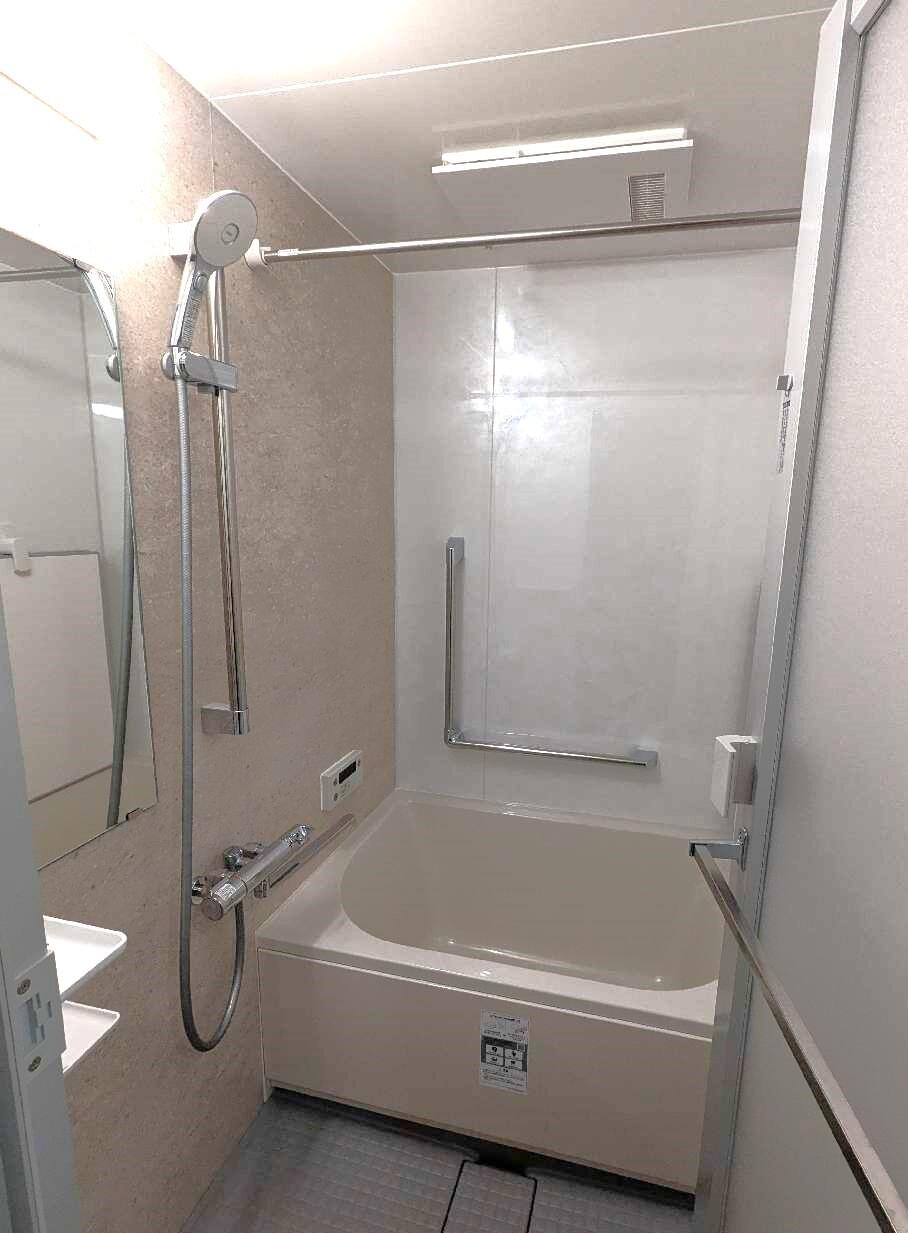 浴室に入る際の段差、浴槽を跨ぐ際の深さなどお困りのご様子でしたので、こちらの浴室の交換と合わせて手摺りの設置工事を行いました。