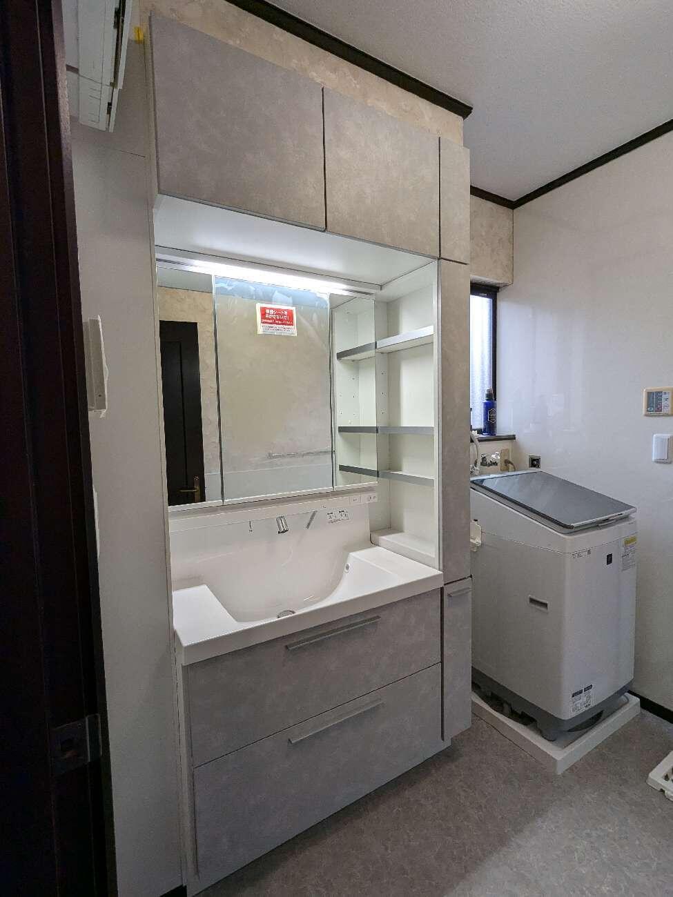 この度は洗面台の劣化によりリフォームをご検討され、掃除し易い、収納が多い快適な洗面台がご希望でした。LIXILのクレヴィの商品をおススメしました。