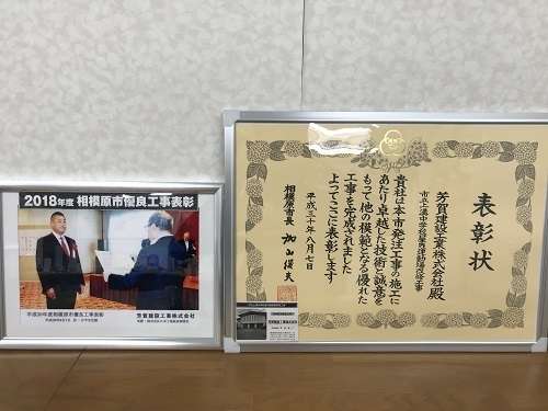 先日、<相模原市優良工事表彰>で頂いた賞状も飾りました!