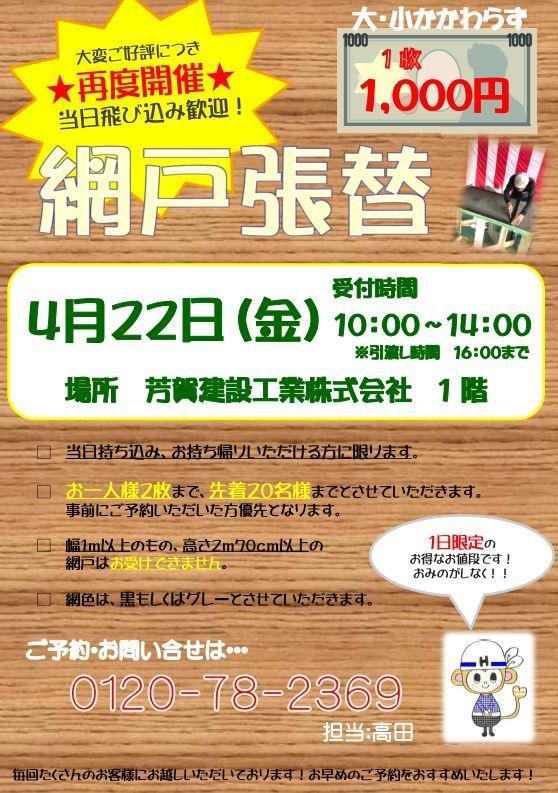 いよいよ今週金曜日「網戸張替」開催いたします!