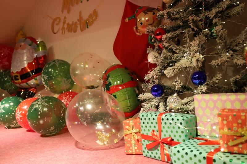 窓を覗いた奥には、ツリーやプレゼント、バルーンで飾り付けられていて、奥行きを感じる作品になっています!