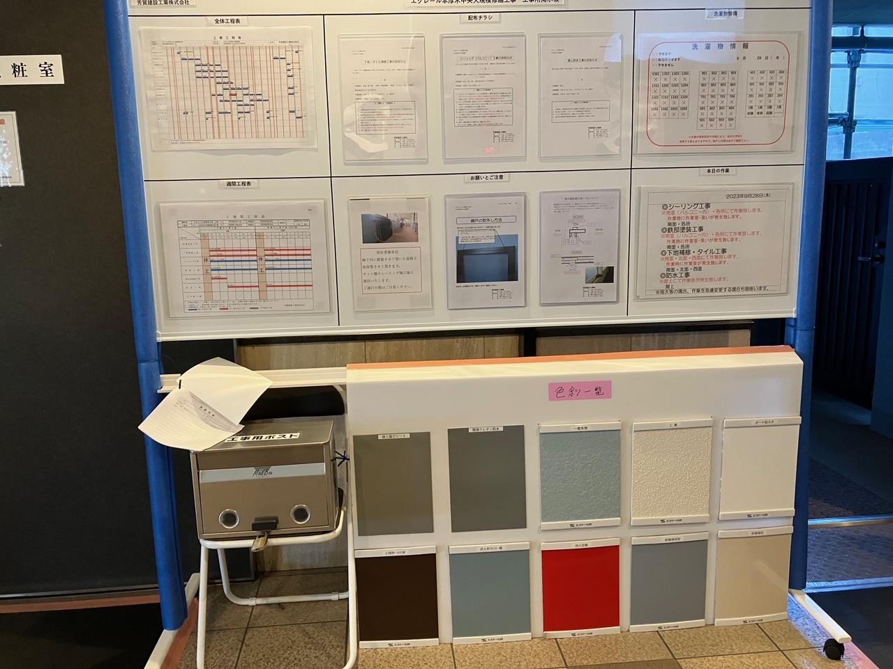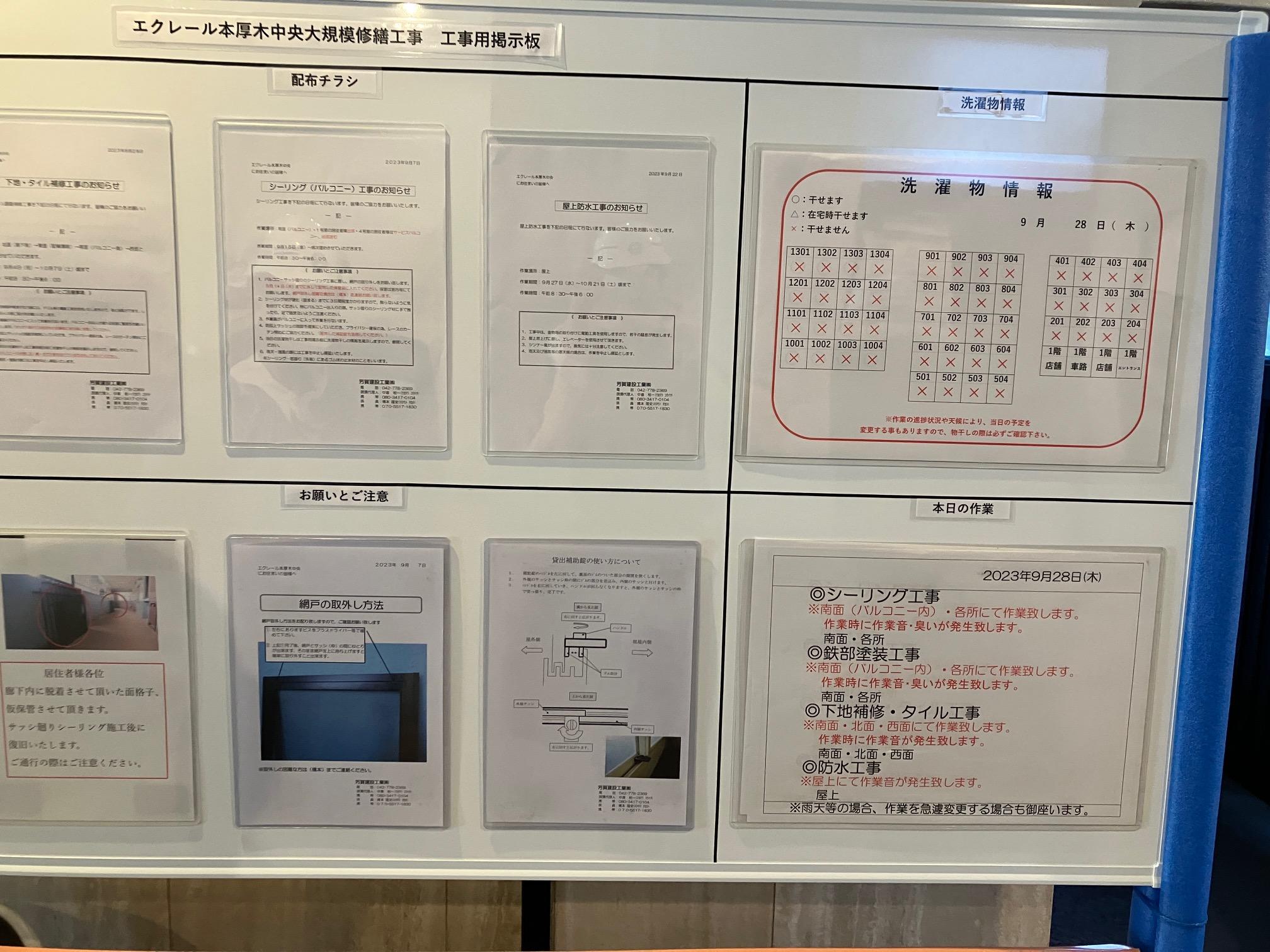 情報を共有できるよう、マンションエントランスには工事状況がわかる掲示がしてありました。