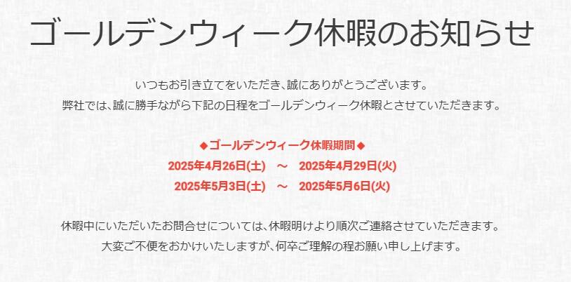 休暇中にいただいたお問い合わせにつきましては、休暇明けより順次ご対応させていただきます。