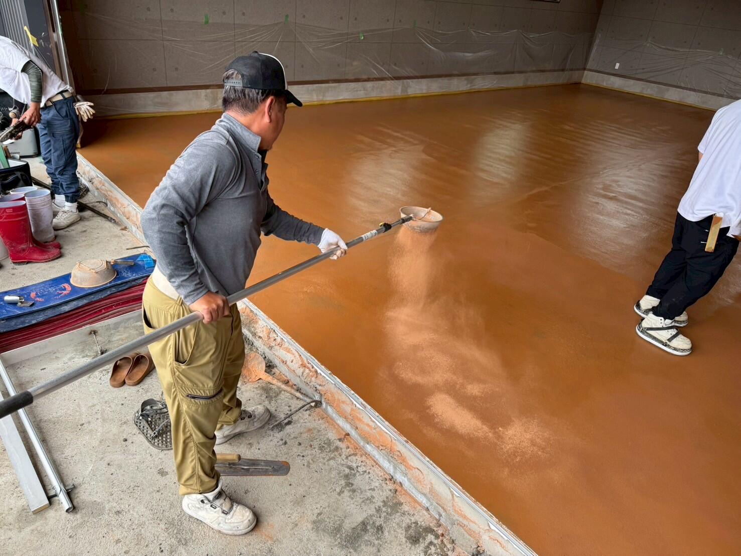 土間コンクリートの上に、基本色となるカラー粉末を散布。