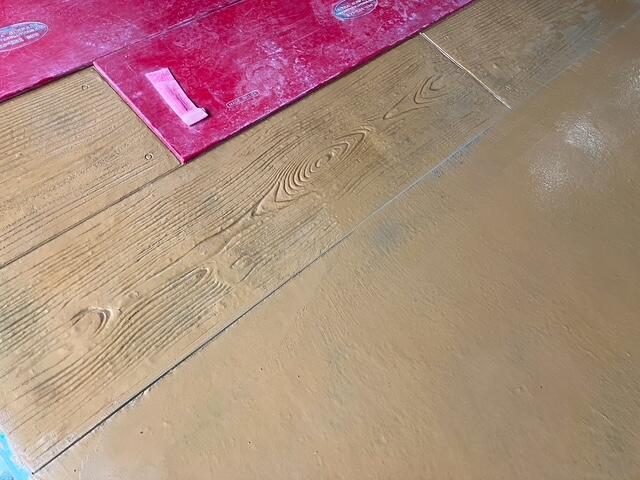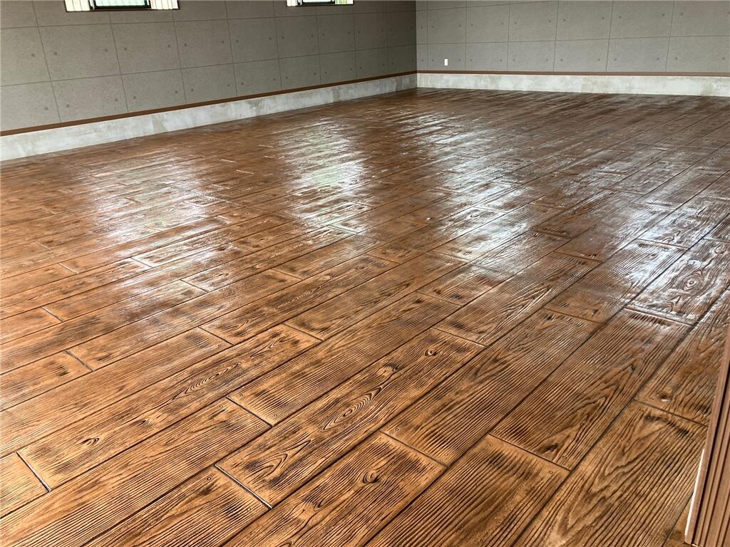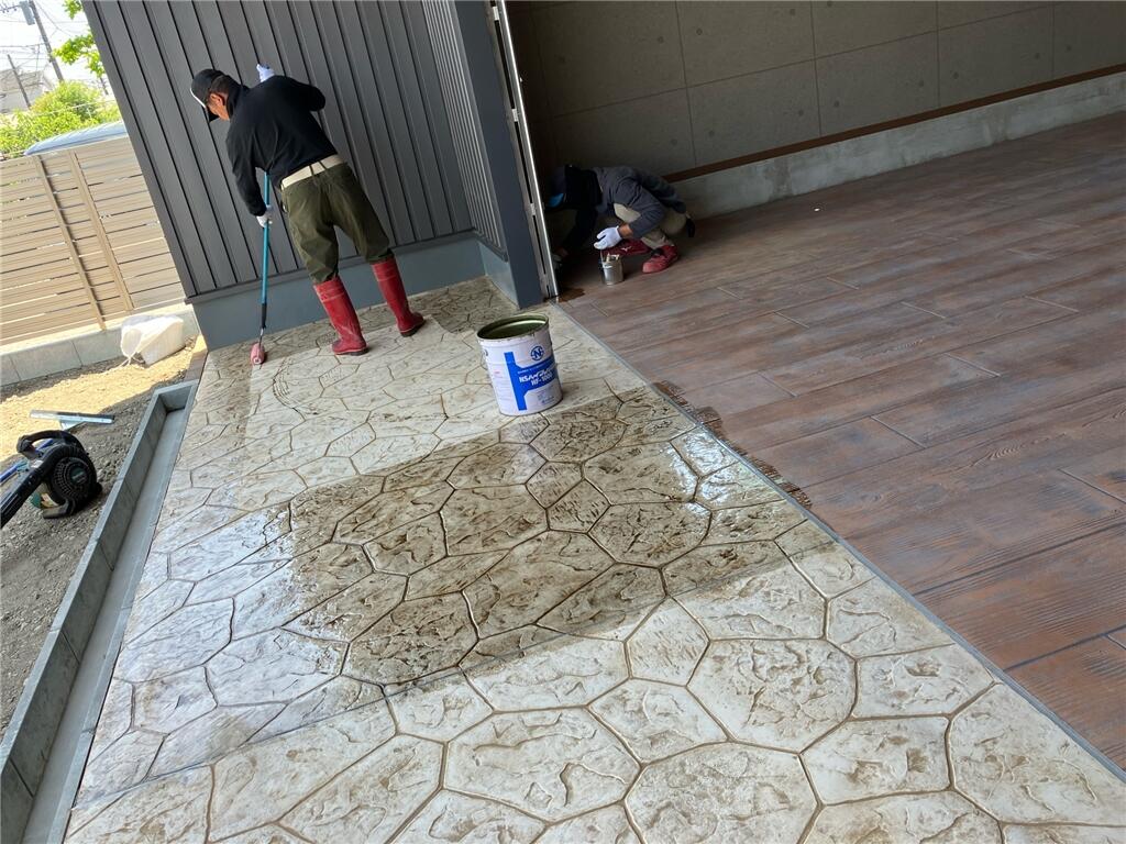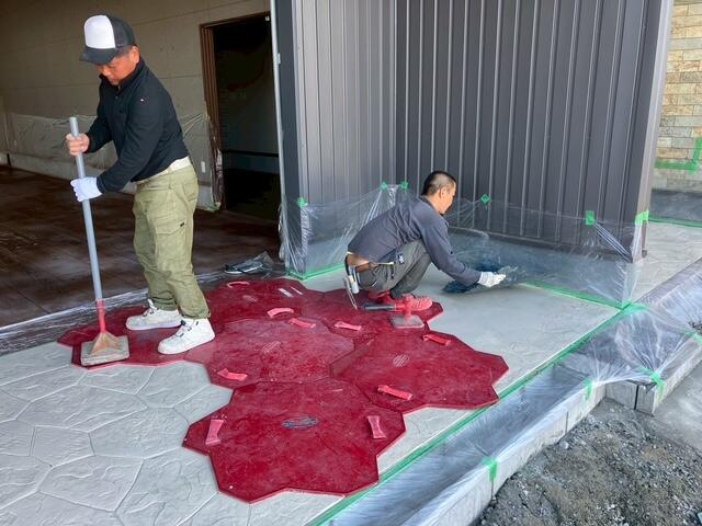 コンクリートの表面に着色を施し、スタンプ板で模様となる型を押し付け、自然石やレンガ、タイル、木といった他の素材そっくりに仕上げる工法のことです。
