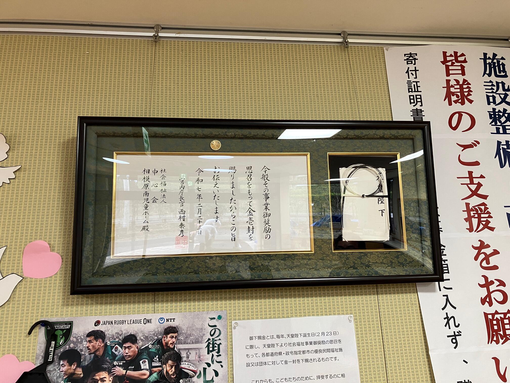 南児童ホーム様の長年の活動が評価され、天皇陛下より御下賜金が下賜されたそうです。
