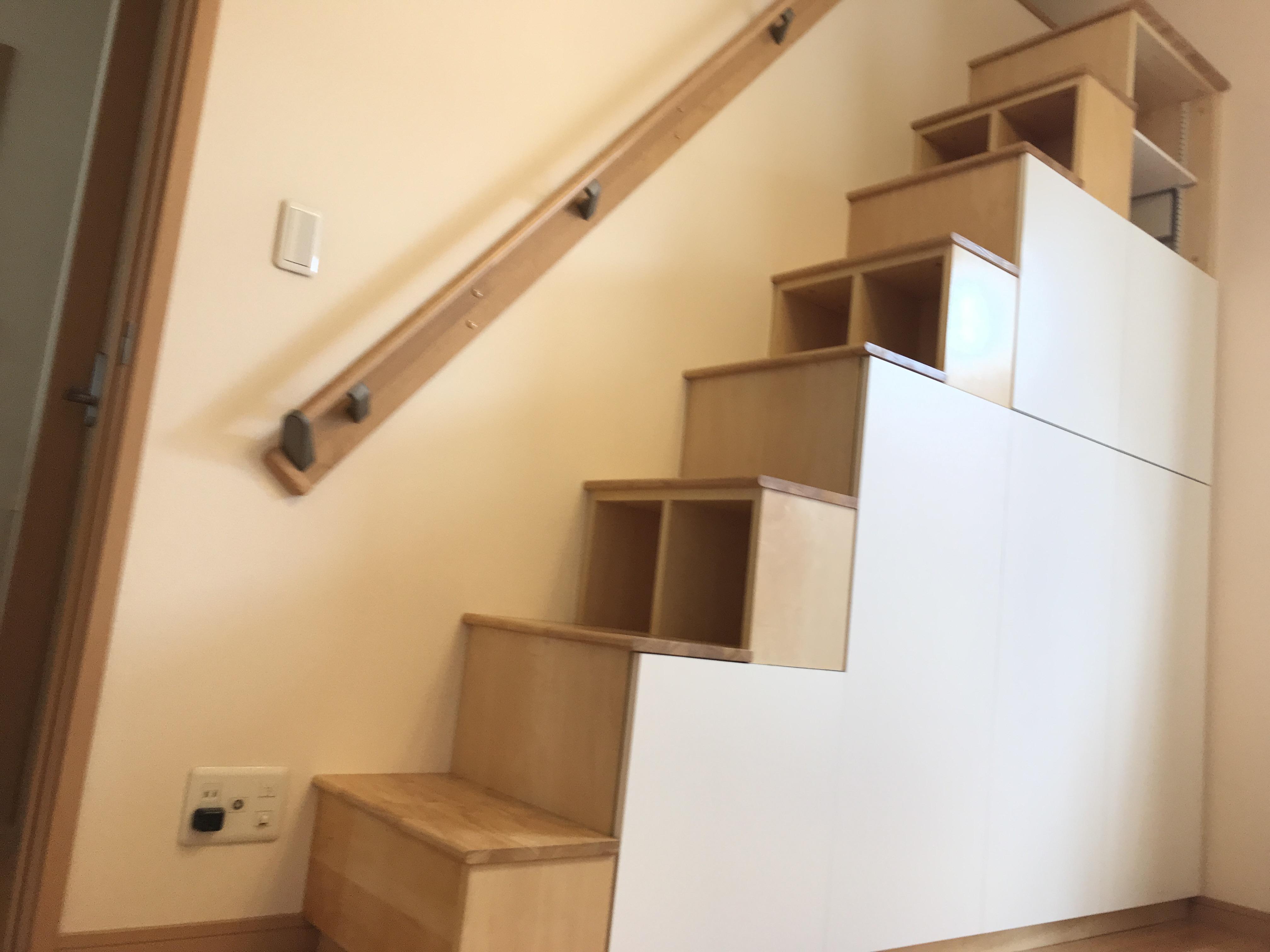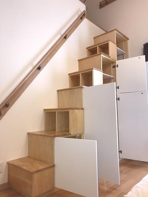 ロフトへ上がる梯子を、安全な階段に。全面収納になっていて、実用性も抜群です。