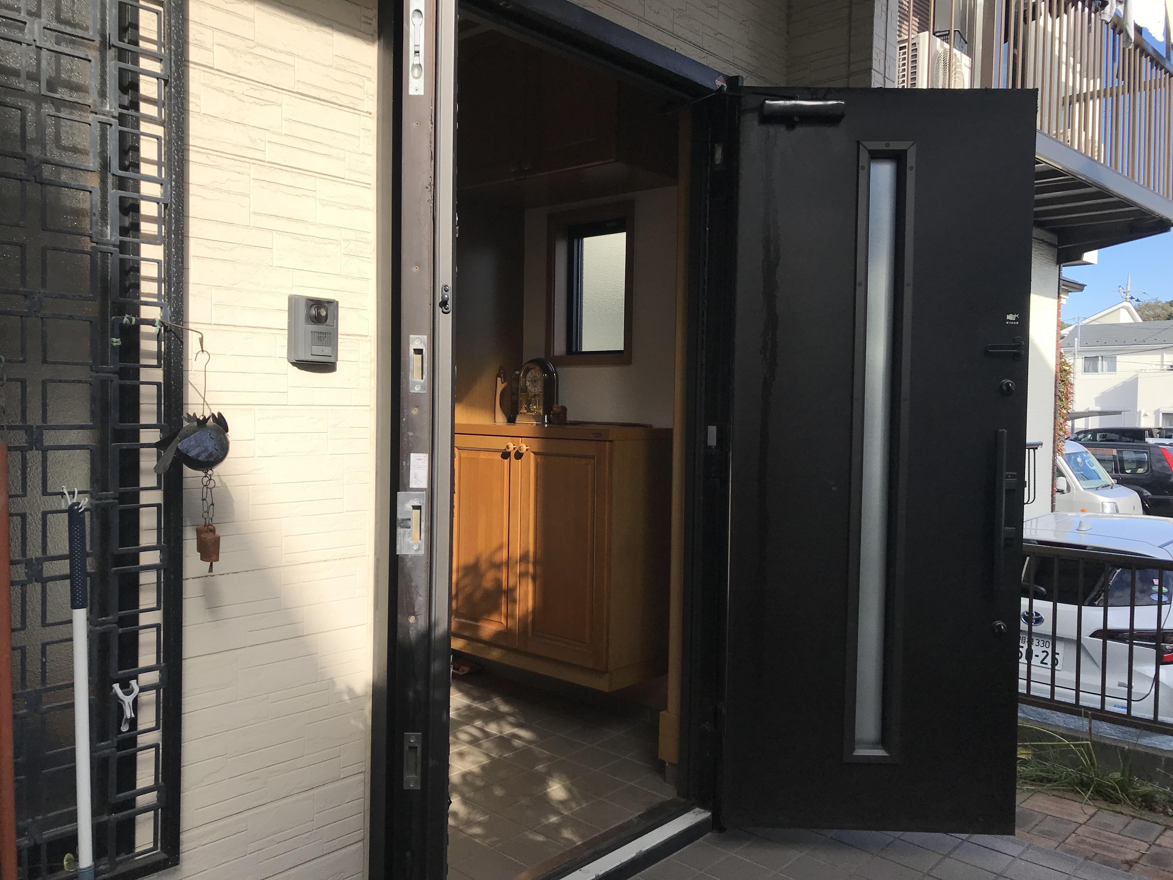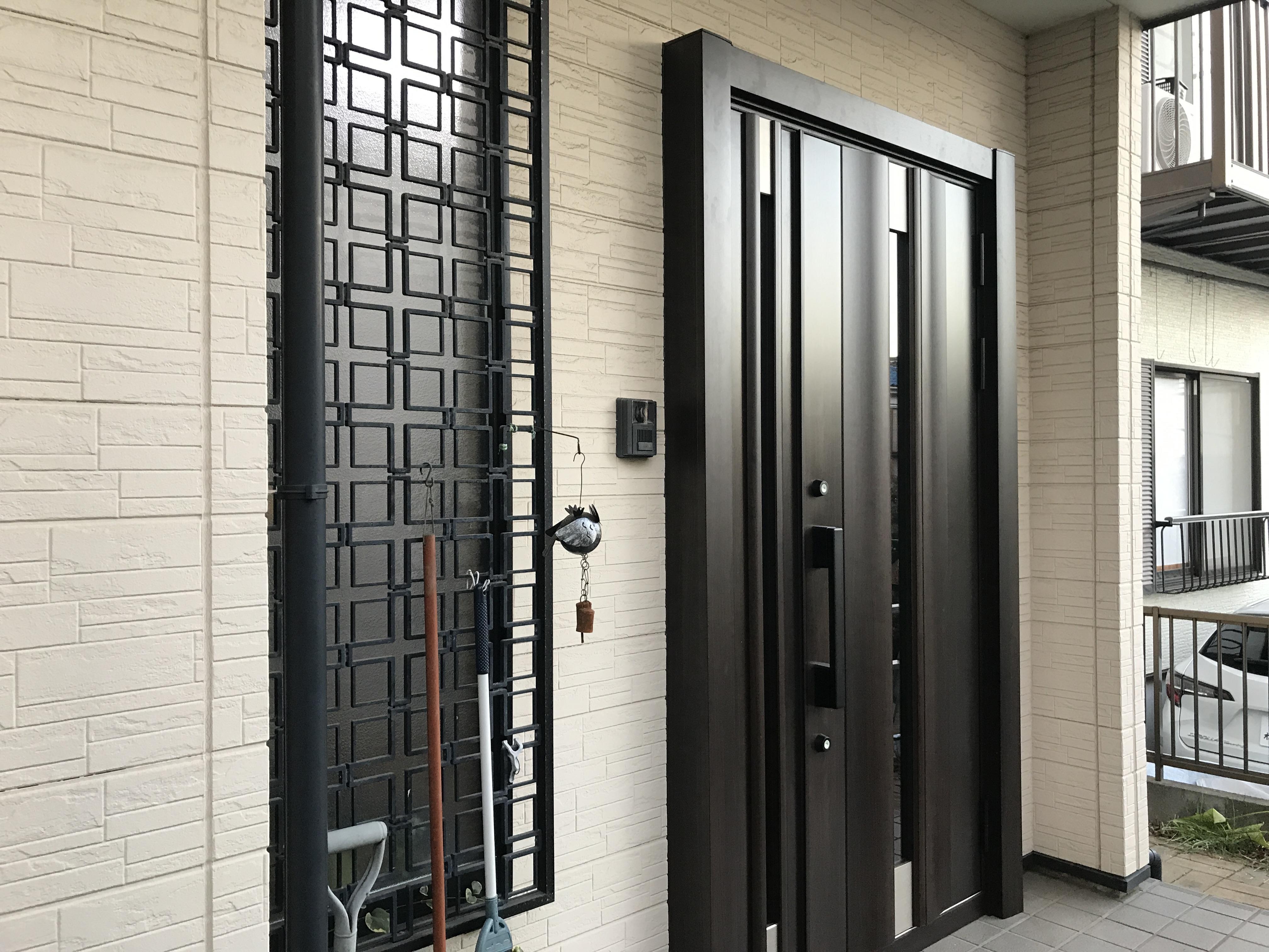 LIXIL「リシェント」12型へとリフォーム。 リシェントの最大の特徴である「高断熱仕様」の快適性と防犯性で決めました。 施工前と同じく親子扉でカラーはクリエダークを。 雰囲気を変え過ぎず、重厚感は増しました。 また「1dayリフォーム」対象だった為、施工がわずか1日で完了する点も魅力でした。