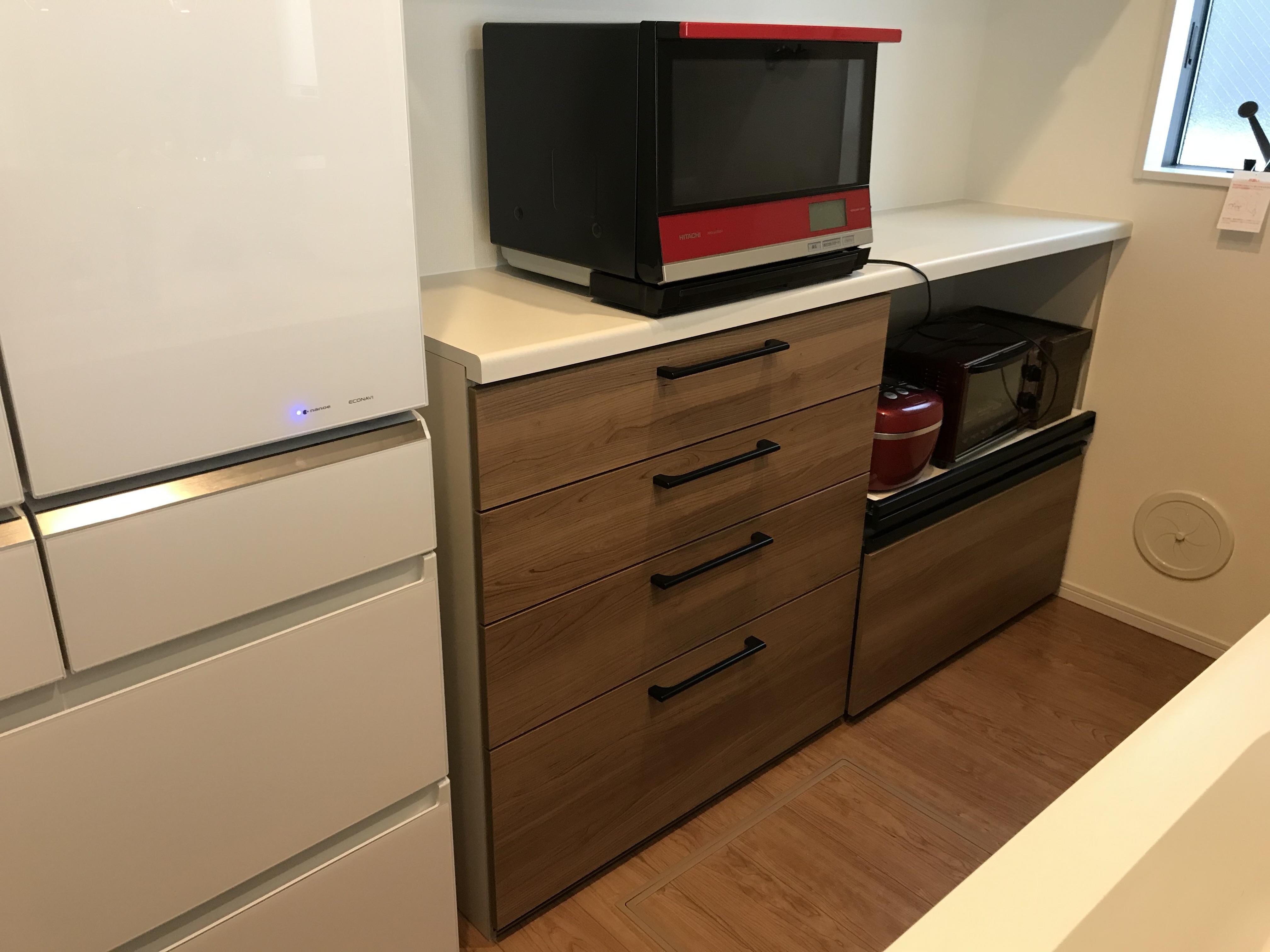 「アレスタ」のキッチンに合わせて、新たにカップボードを設置。 収納が増え、キッチン周りをスッキリとお使いいただけるようになりました。