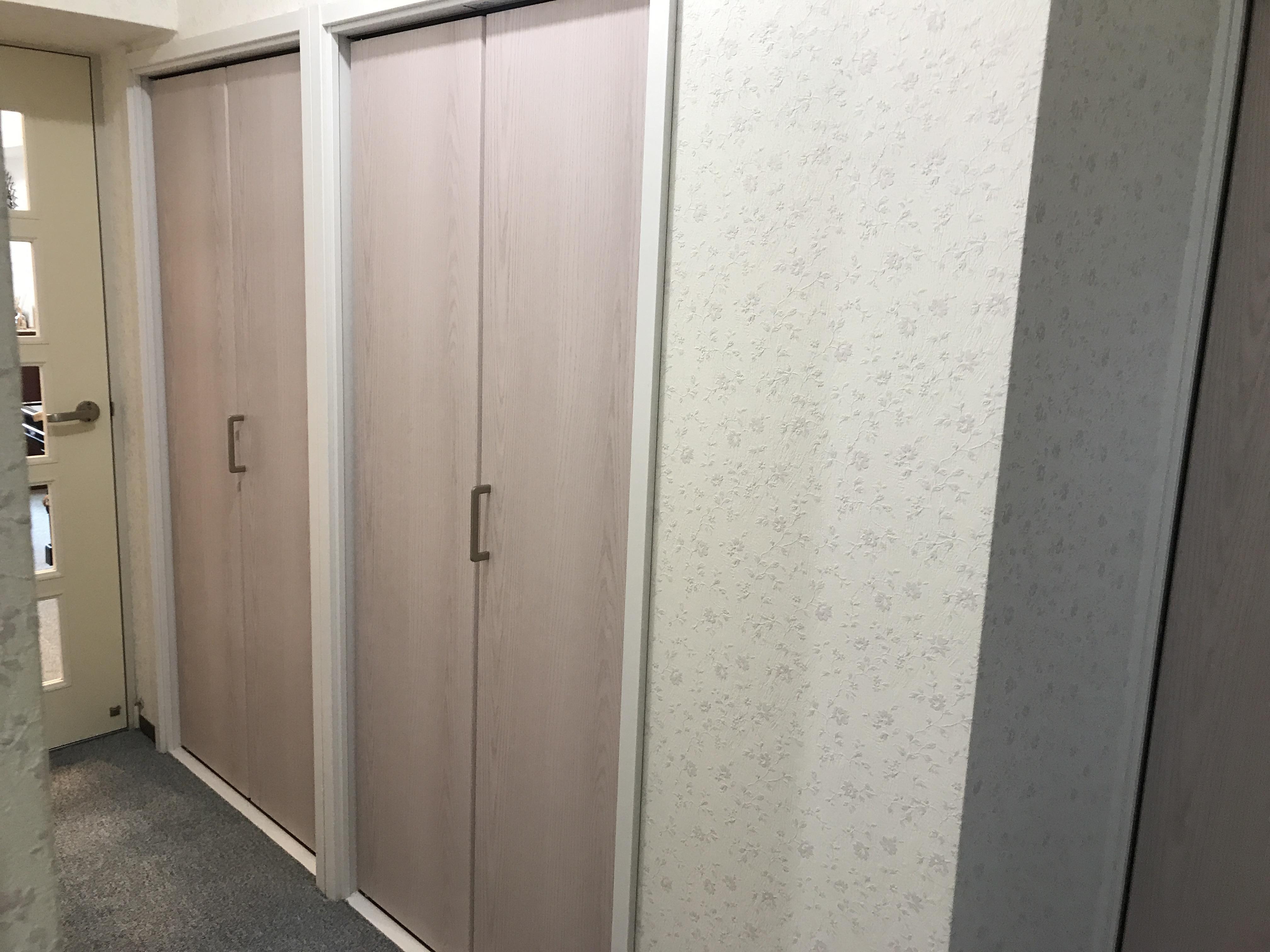 収納扉の交換でご相談いただきました。 LIXIL【ラシッサD】のピンクアッシュに交換。 元の壁紙ともマッチして可愛い空間になりました!