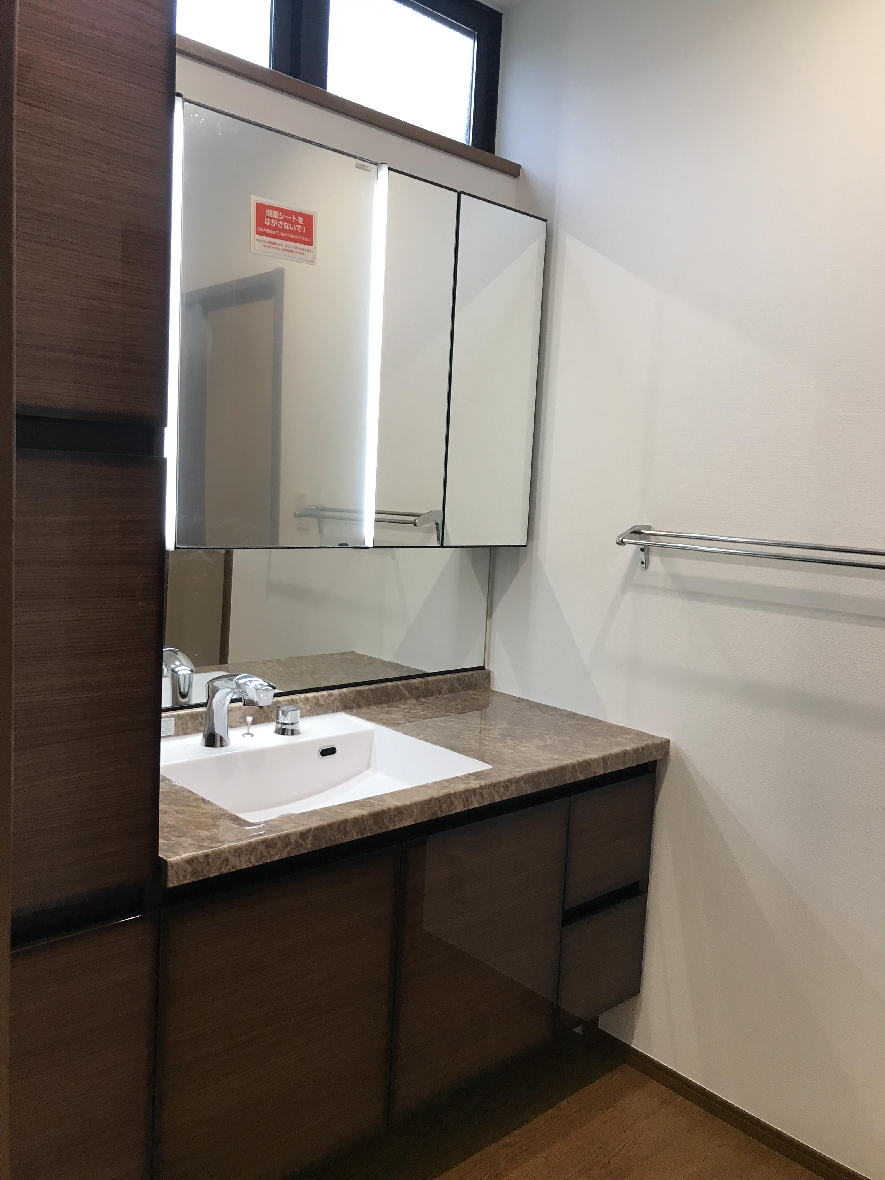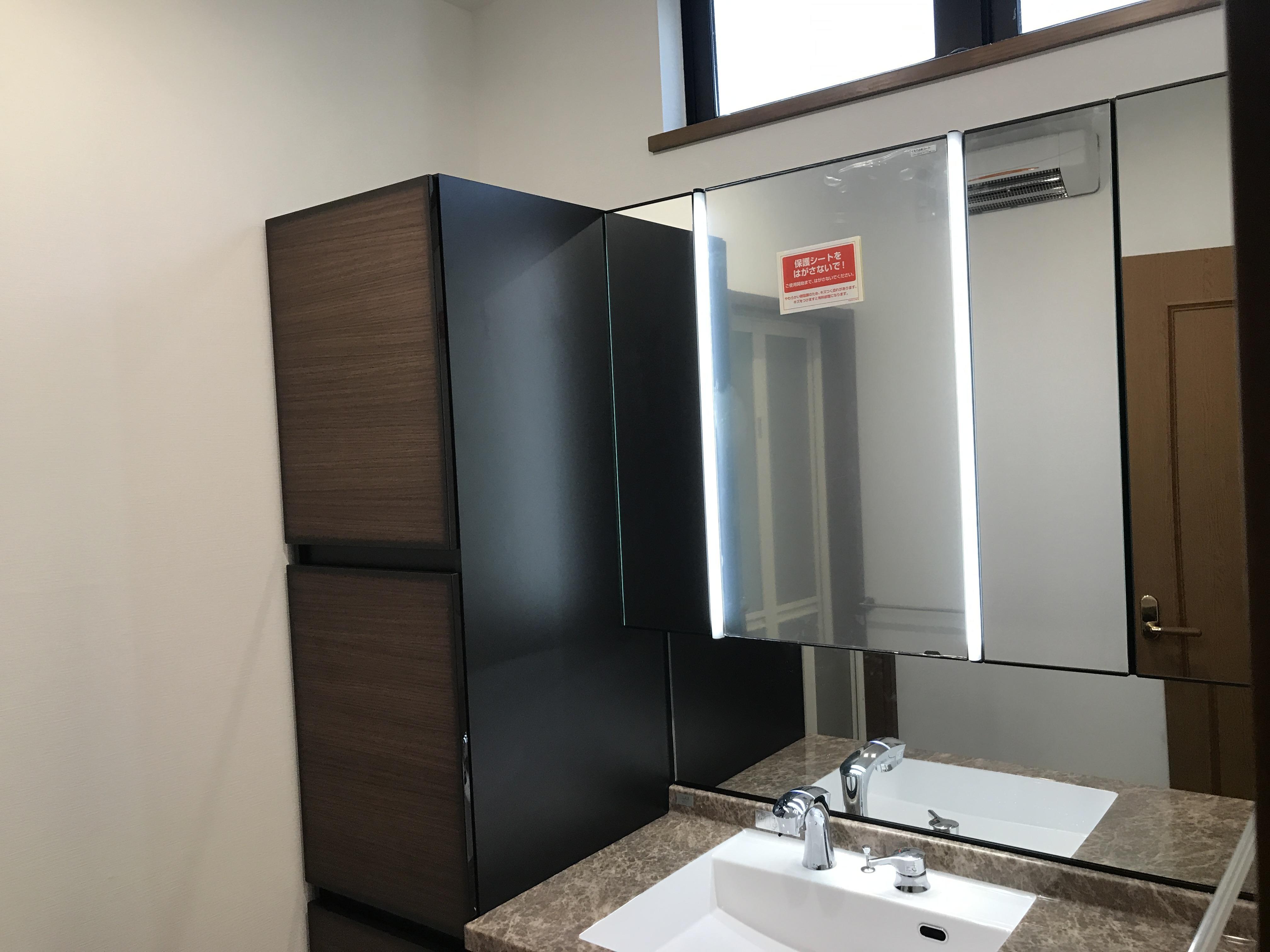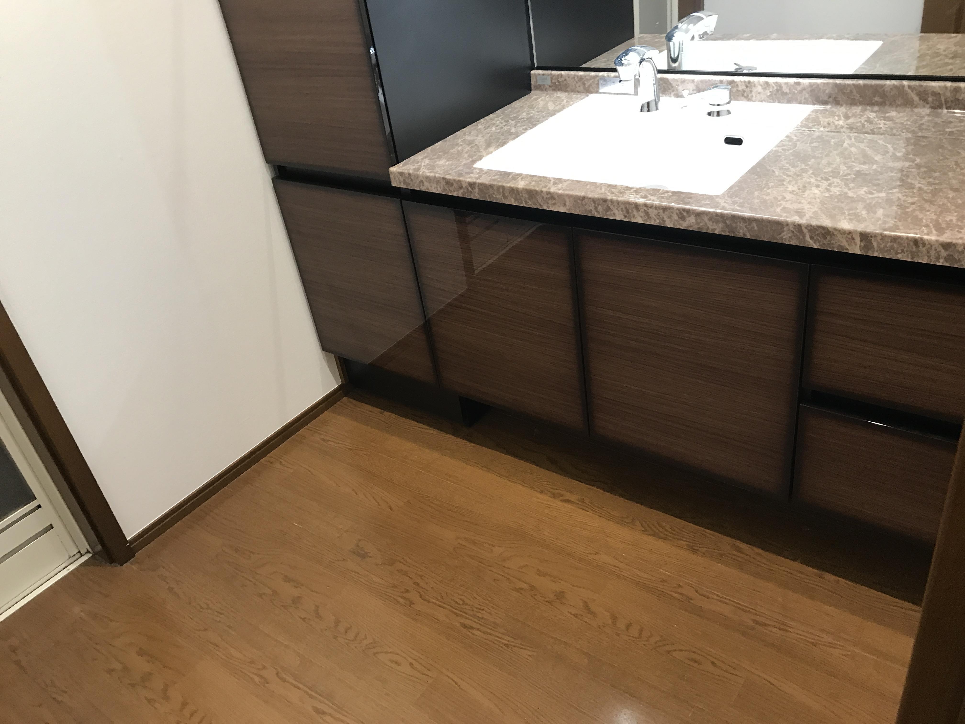 床色と馴染む色味のアンティークブラウンをチョイスしたことで、統一感が生まれ、優雅で豊かな時間を洗面空間でお楽しみいただけるようになりました。