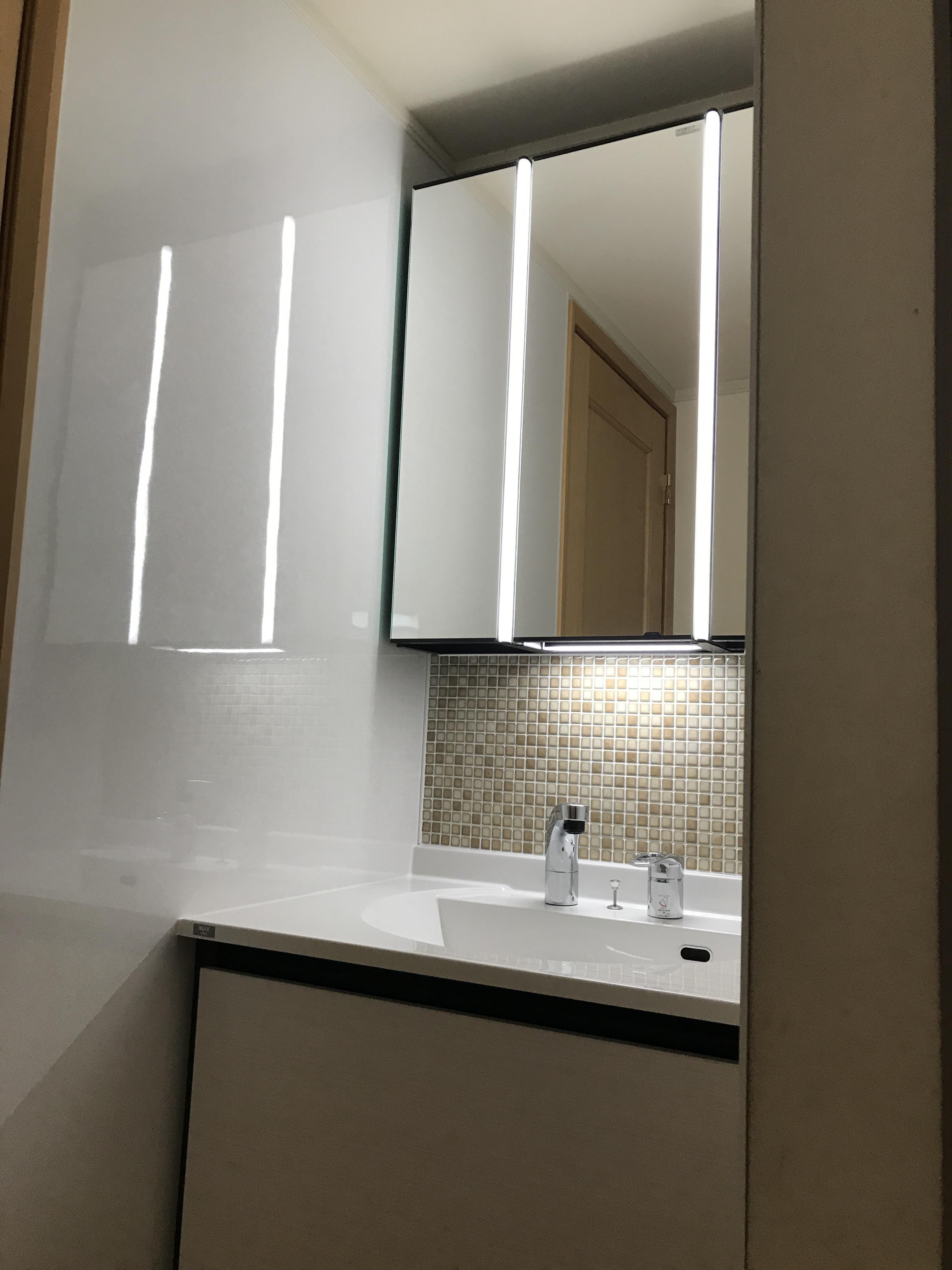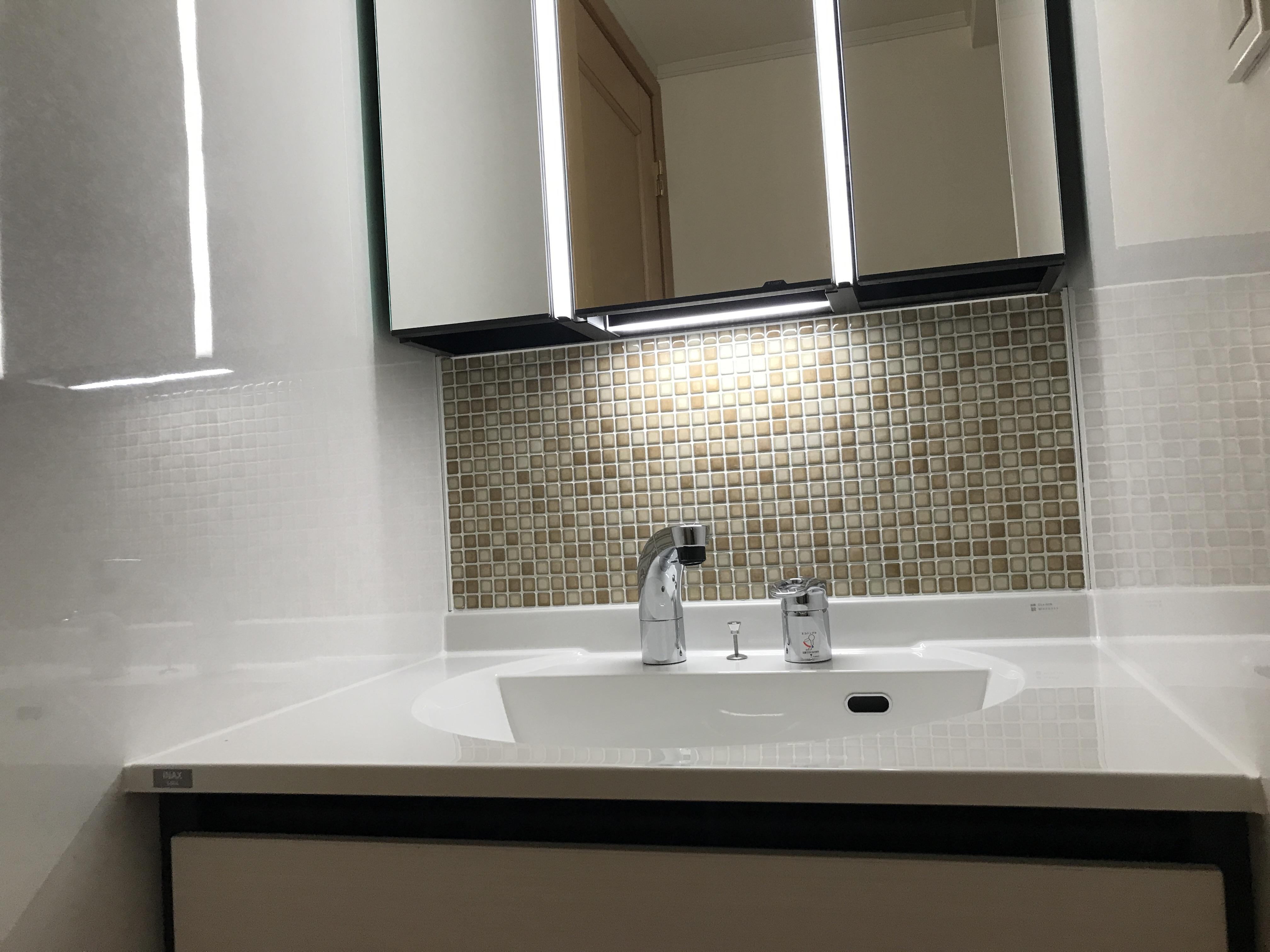鏡下には【インテリアモザイク カレイドグレイズ】のタイルを貼り付け、アンティーク感のある仕上がりに。
