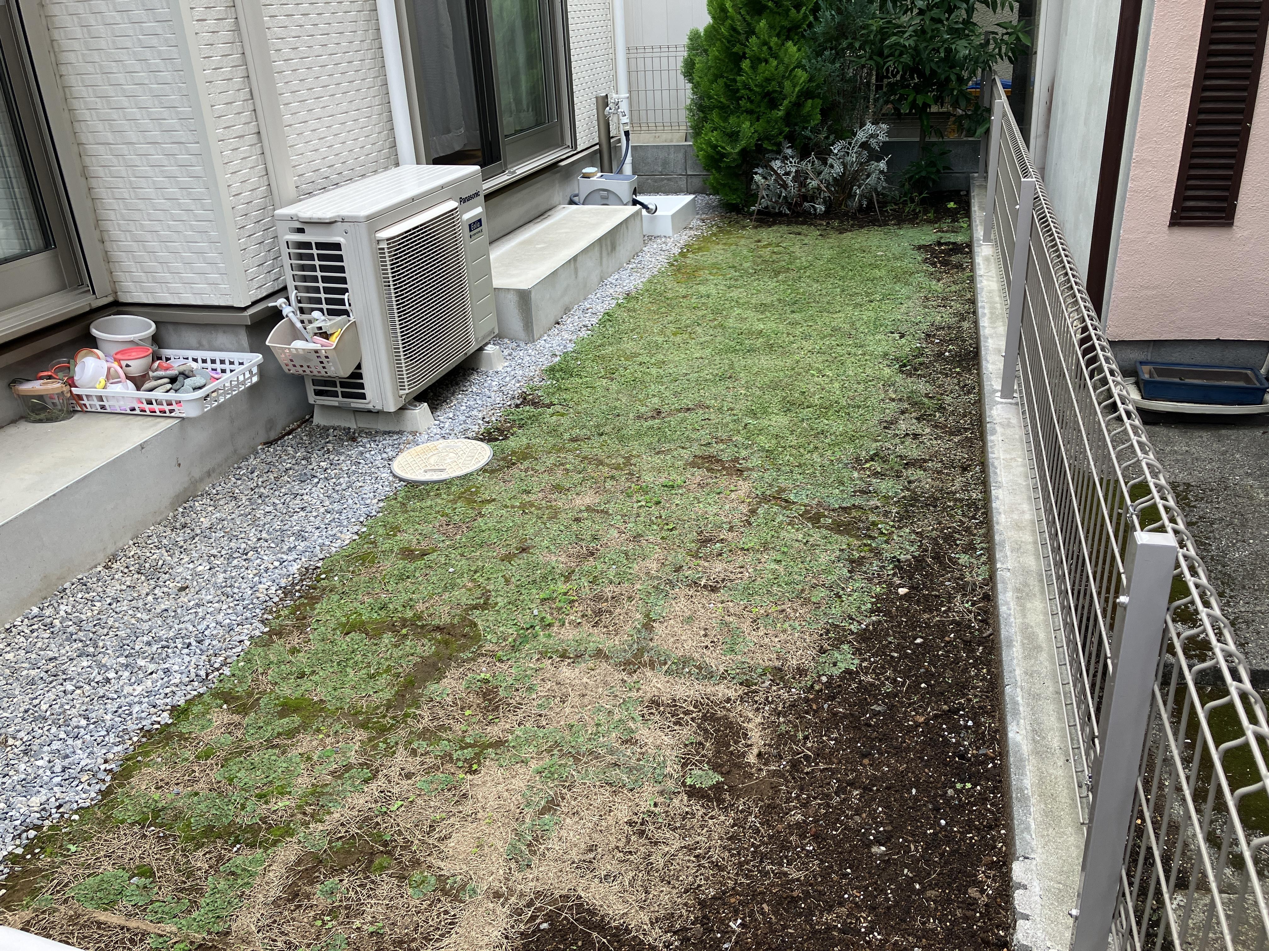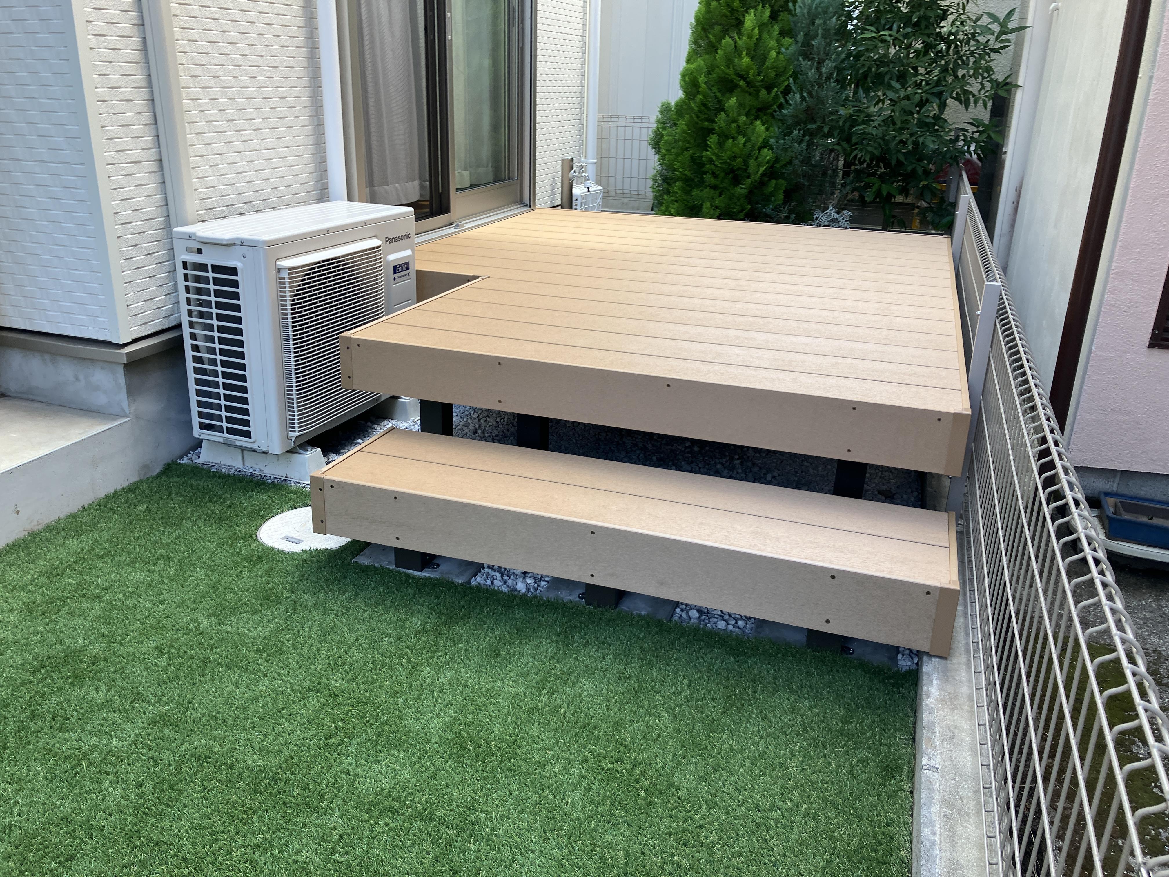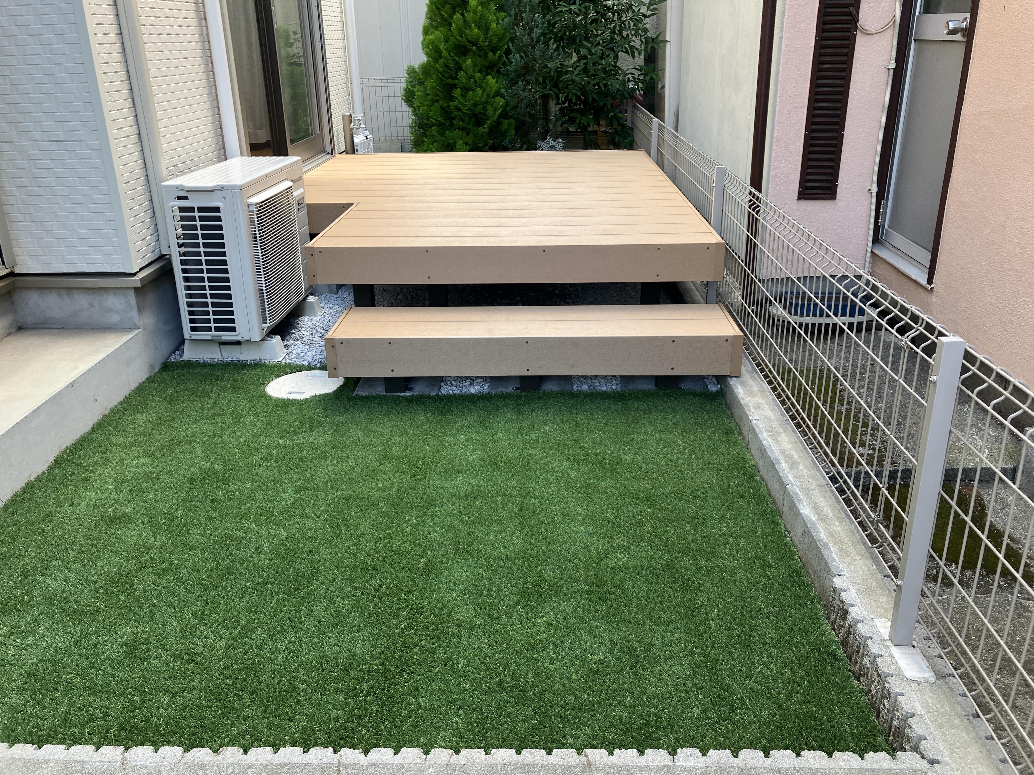 お庭が荒れてきてしまい、新たにウッドデッキの設置をお考えだったN様。 使いやすい人口木材【樹ら楽ステージ】をお選びいただきました。 顔料に、太陽光線を反射する特殊タイプを採用し、真夏でもでき表面が暑くなりにくく、快適に過ごせます。 雨シミは、水でふきとることでキレイになるので、日々のお手入れも簡単です。 地面には人工芝を敷き、見た目もさわやかに。 お庭に憩いのスペースができました!