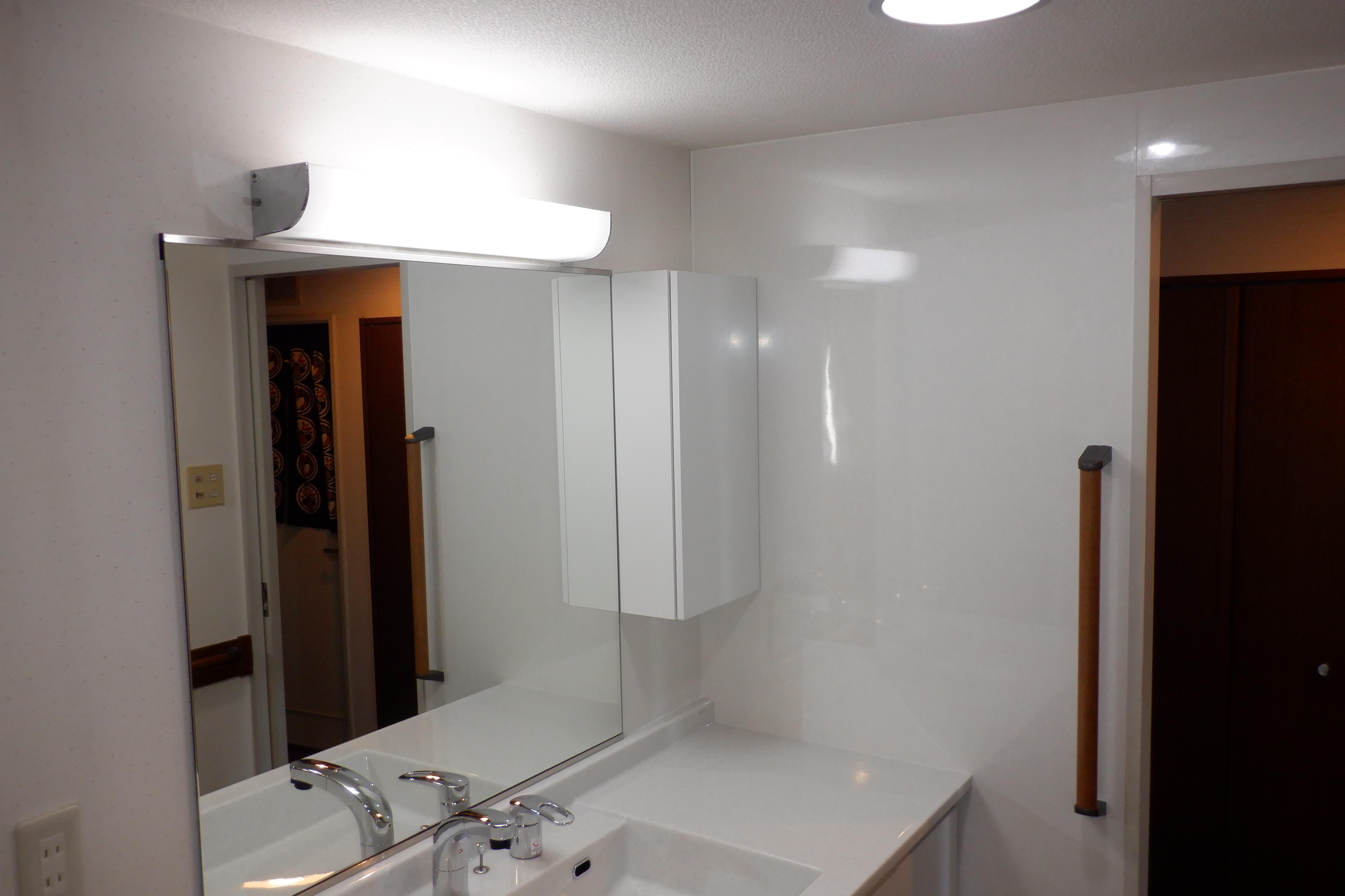 特寸サイズの1枚鏡もきれいにおさまり、使いやすさは変わらず、お手入れのしやすい空間になりました。