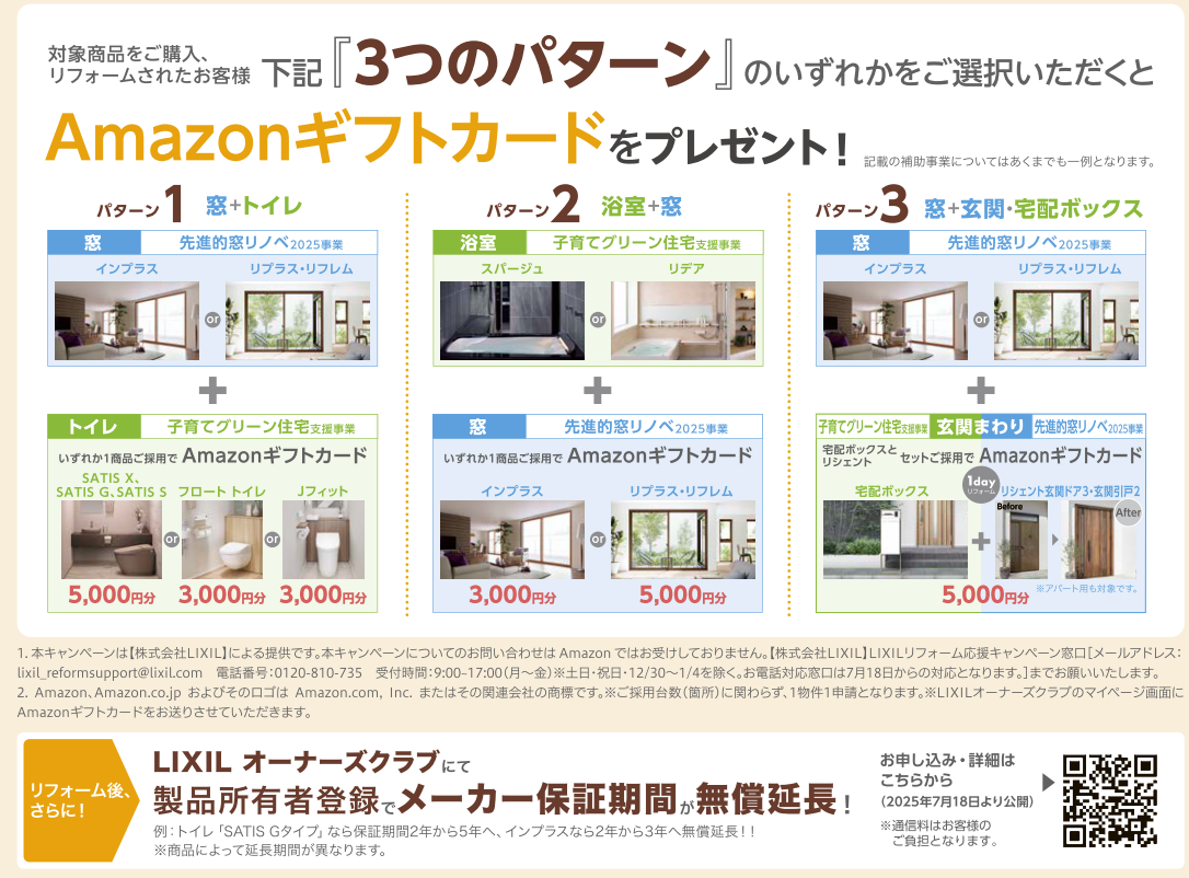 3つのパターンのいずれかをご選択ご購入ののち、リクシルオーナーズクラブに会員登録いただきますとAmazonギフトカードをお受け取りいただけます。