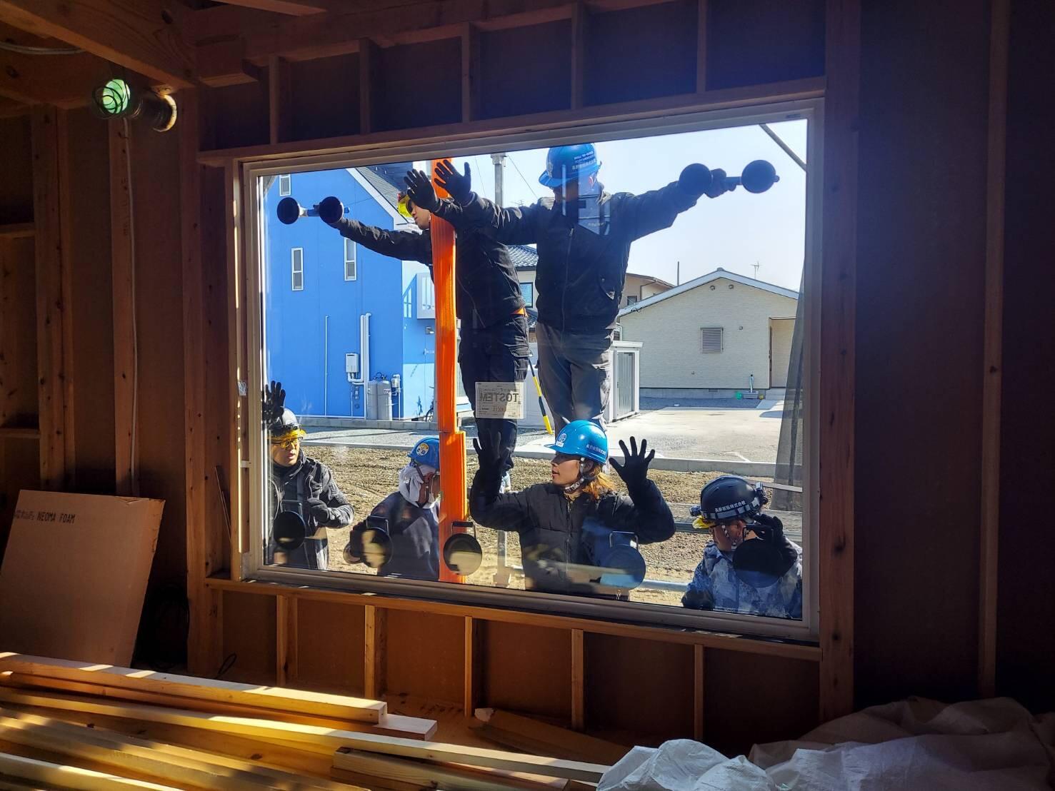 120キロの窓ガラスを、大人6人ではめ込んでいます