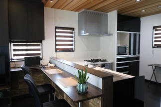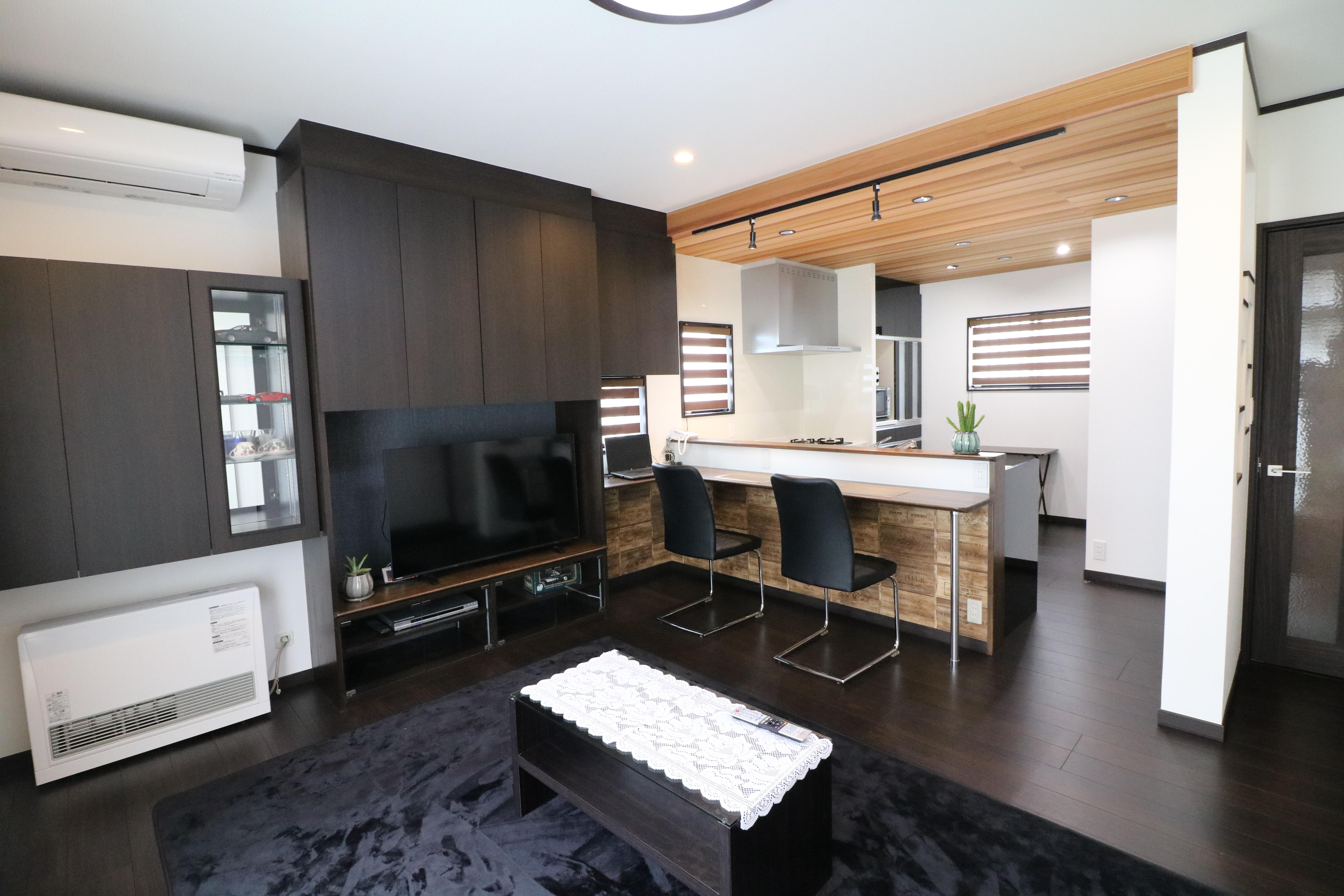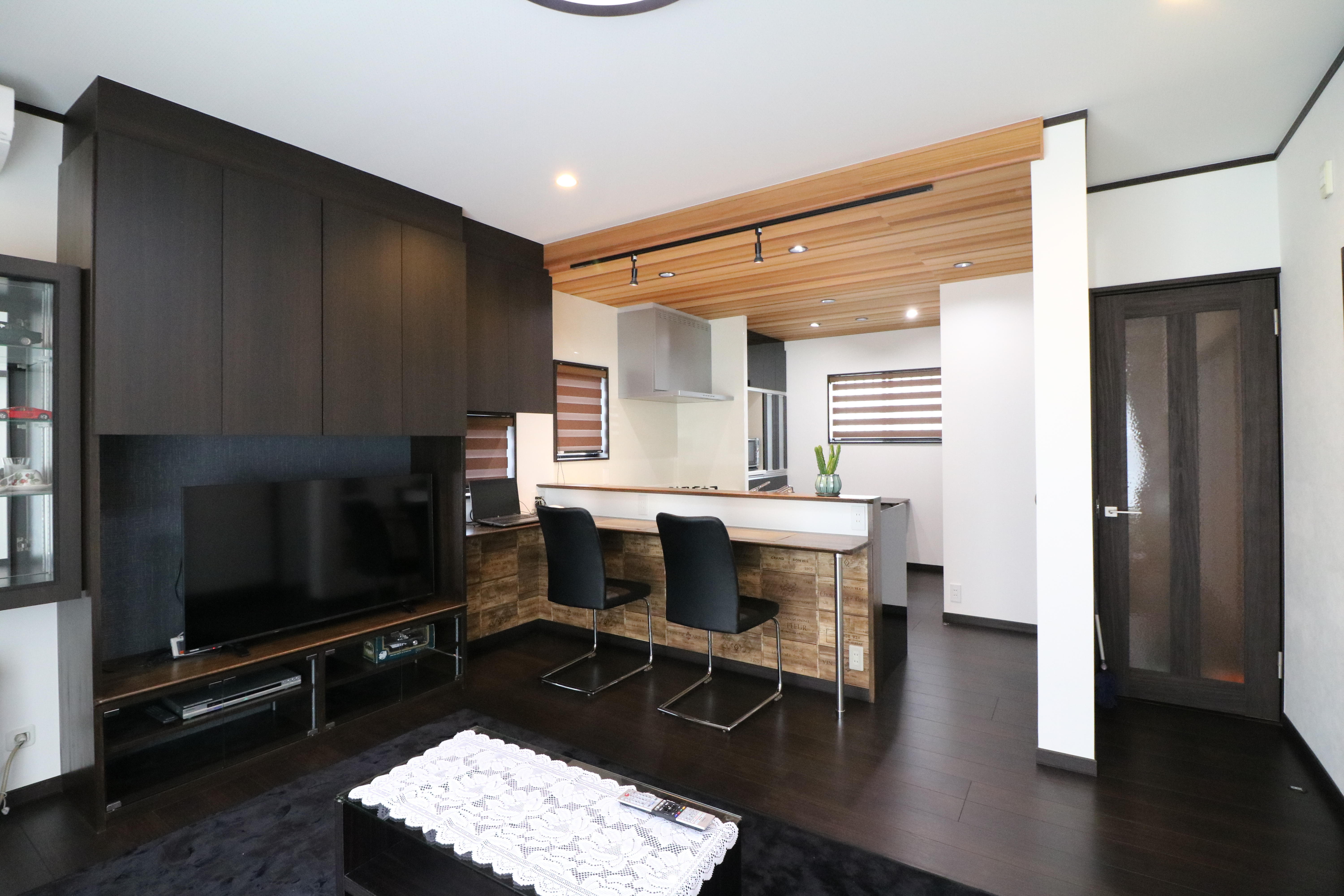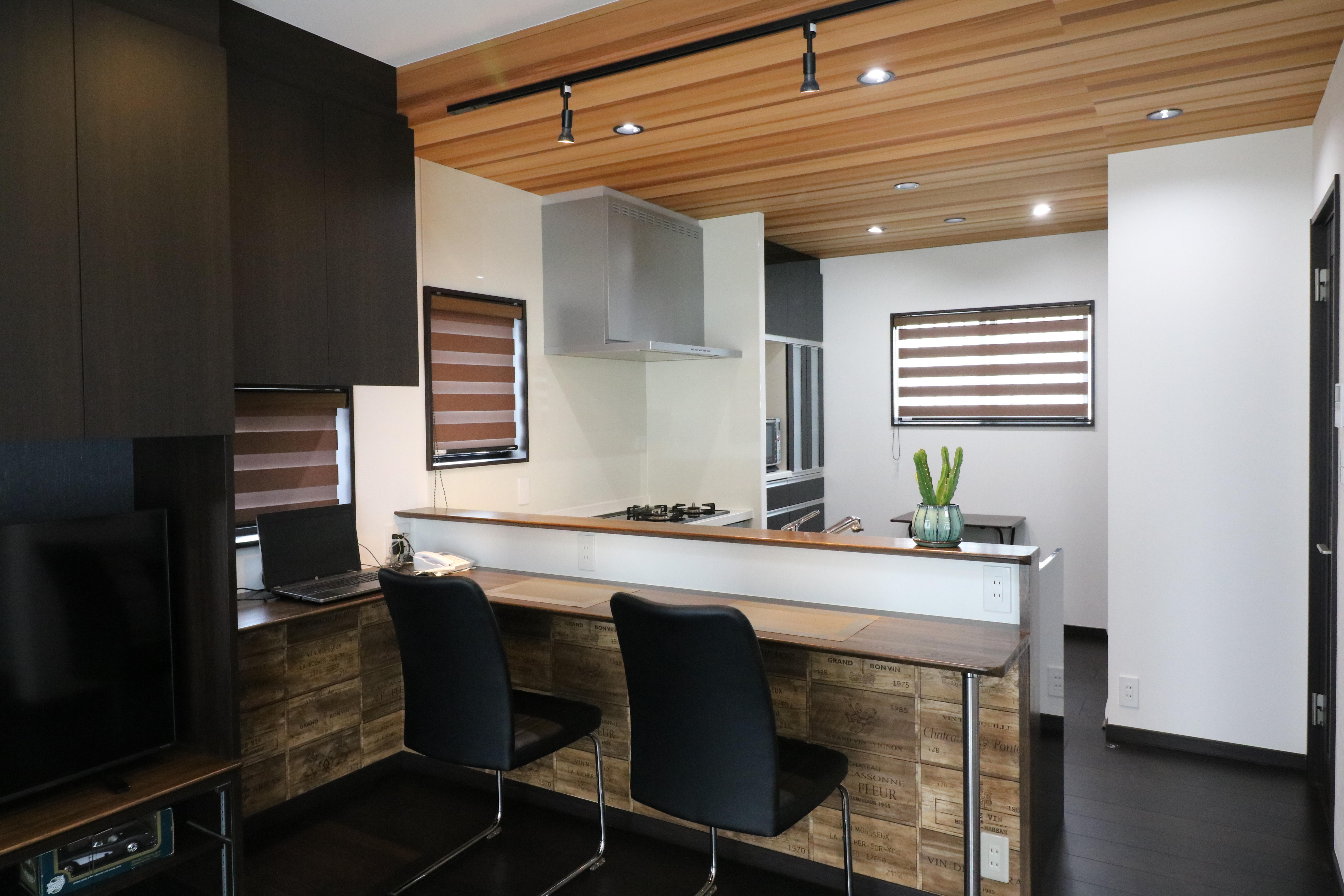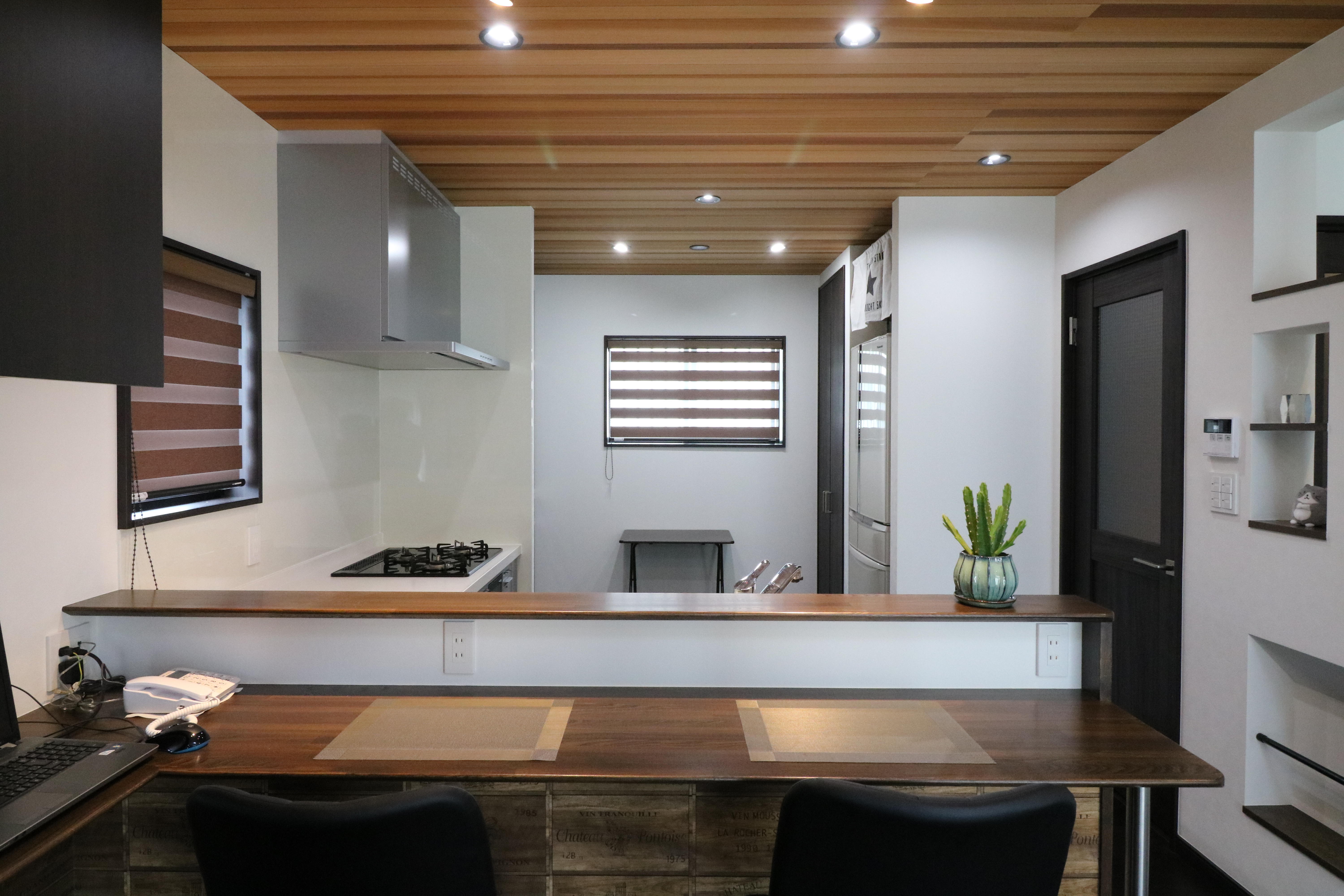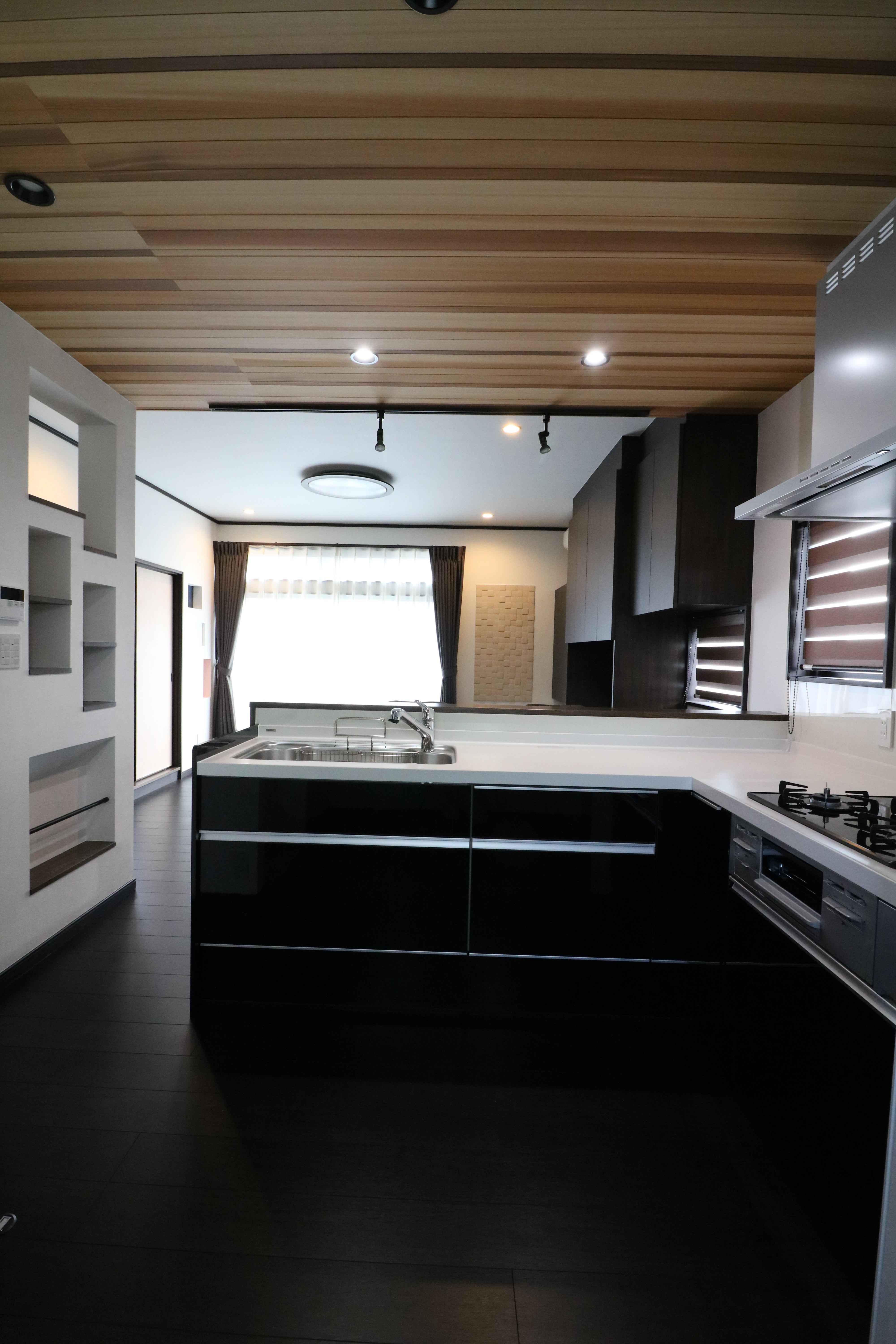 使い勝手のよいL字型のキッチン。黒に木目調の天井が映えます。