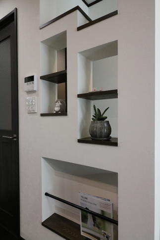 リビング、キッチン用と二つの入り口を設置。その境にニッチを作り明かりを通し、飾りも楽しめます。