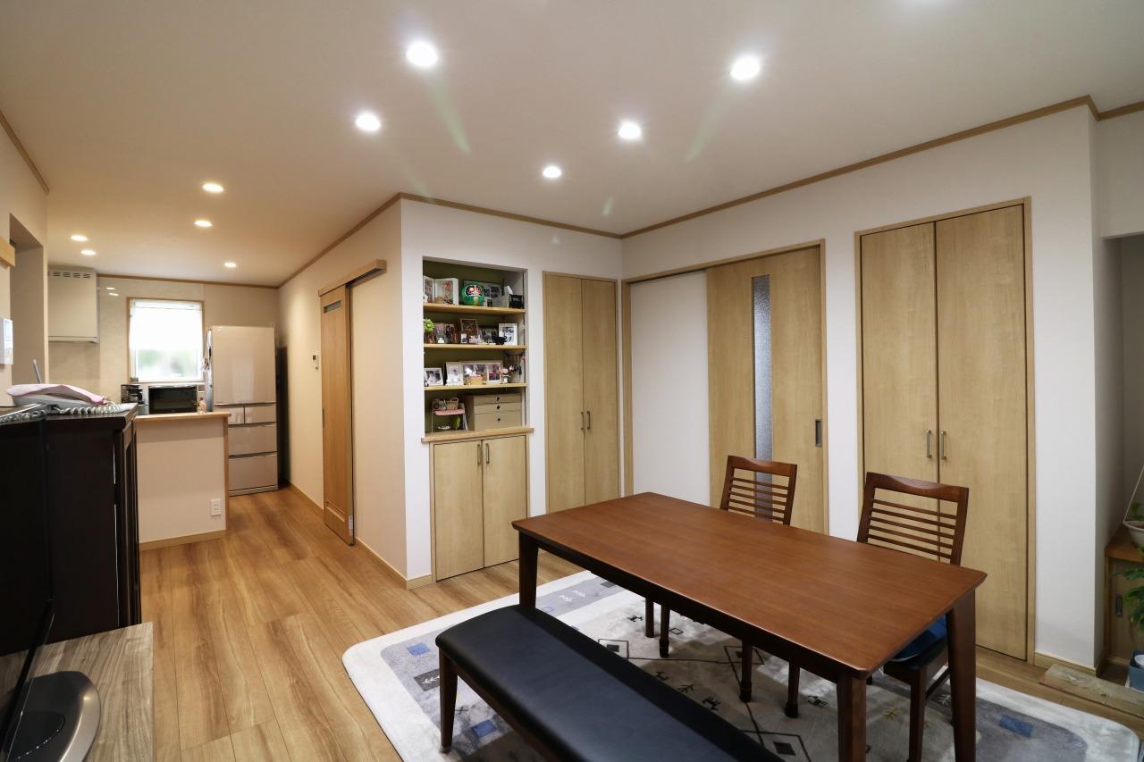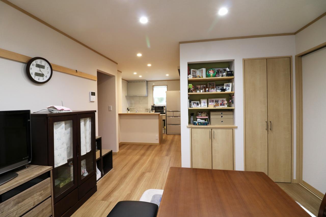 中廊下を無くし、キッチンとリビングをひとつながりの空間にすることで、キッチンからリビングに居る家族の気配を感じる開放的な空間にしました。 狭かった浴室、トイレの広さにも余裕ができ、さらに引き戸を多用することでバリアフリーに配慮しました。 LDKでほぼ一日が過ごせるように、収納を多めにし水周りも隣接させました。最近亡くなったご両親の仏壇をリビングに移設できる場所も確保しました。 キッチンと、サニタリーのスムーズな家事動線を確保するようにしました。