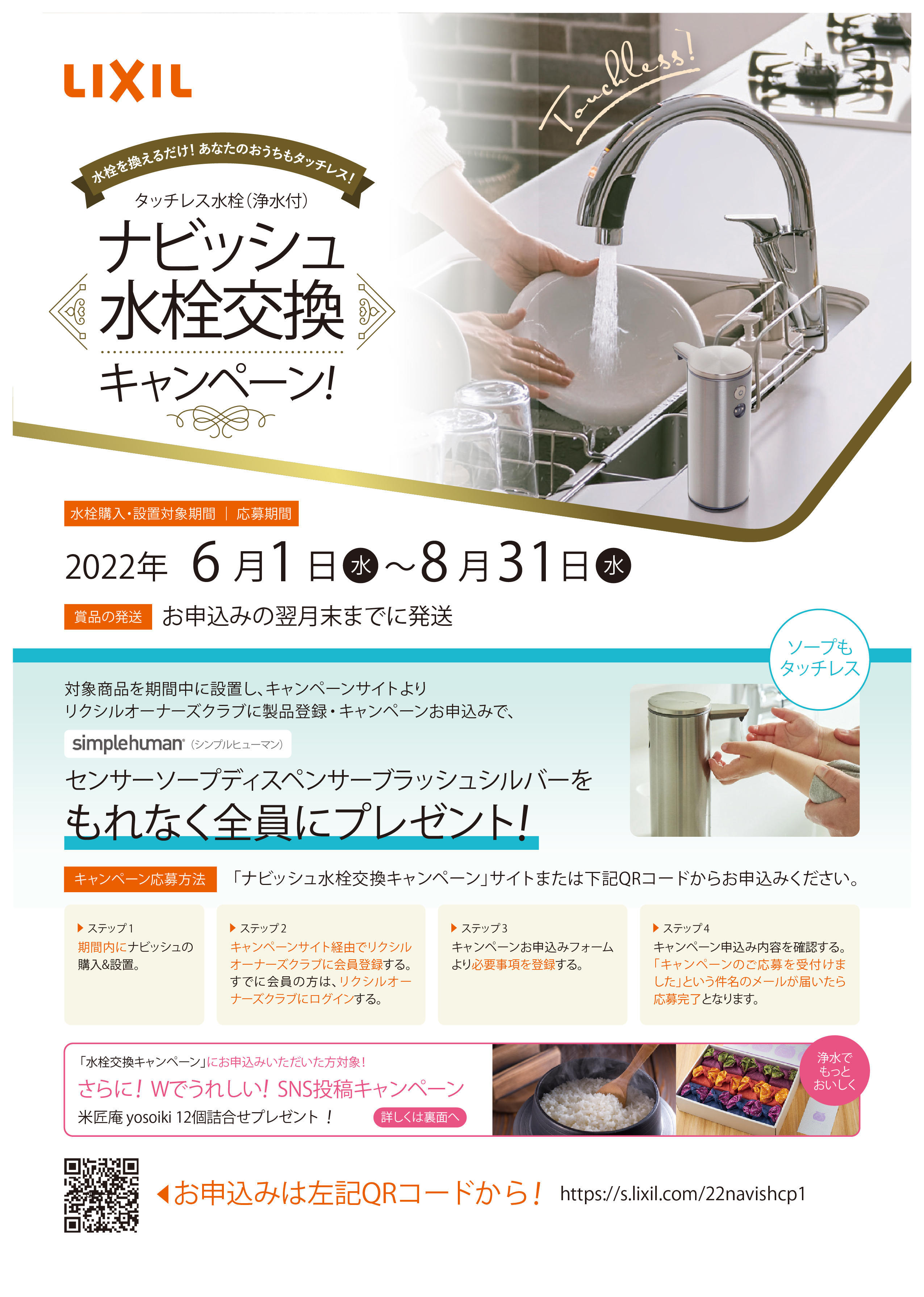 期間中にタッチレス水栓を購入・設置して頂き、キャンペーンサイトより製品登録・キャンペーン申込で、