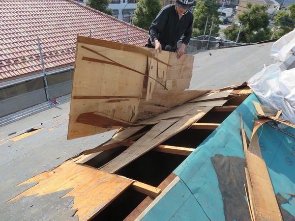 経年による痛みもあるでしょうが、今年の梅雨の長雨により、気が付いたら屋根野地板 (ベニヤ)が手品のように簡単に手で剥せるほど痛んでました。 アパートの屋根だったので工期1ヶ月、工事金額700万ほどかかりました。