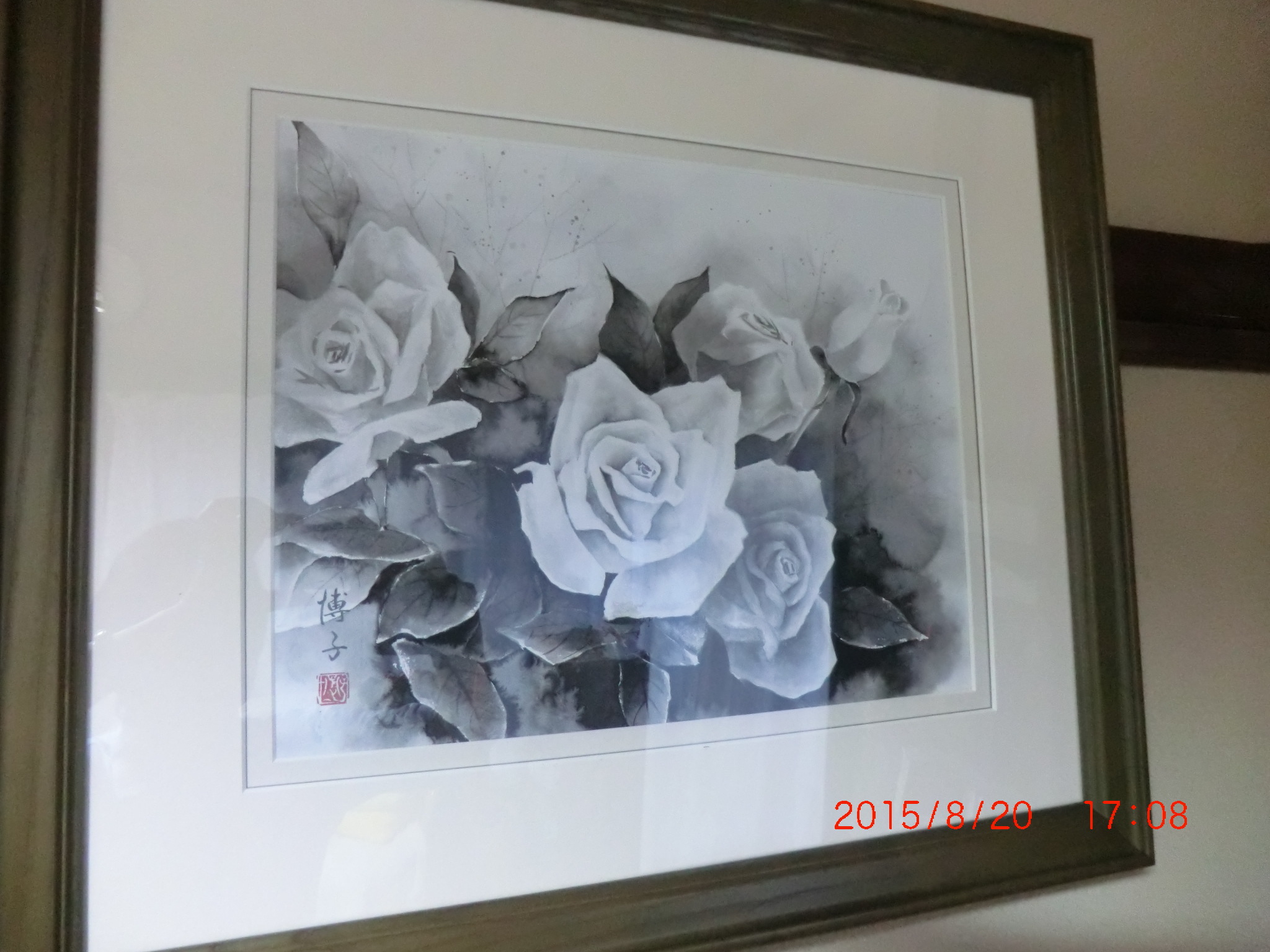 絵は水墨画です。水墨画イコール山河とかが多いですが、薔薇の絵もひときわ素敵です。