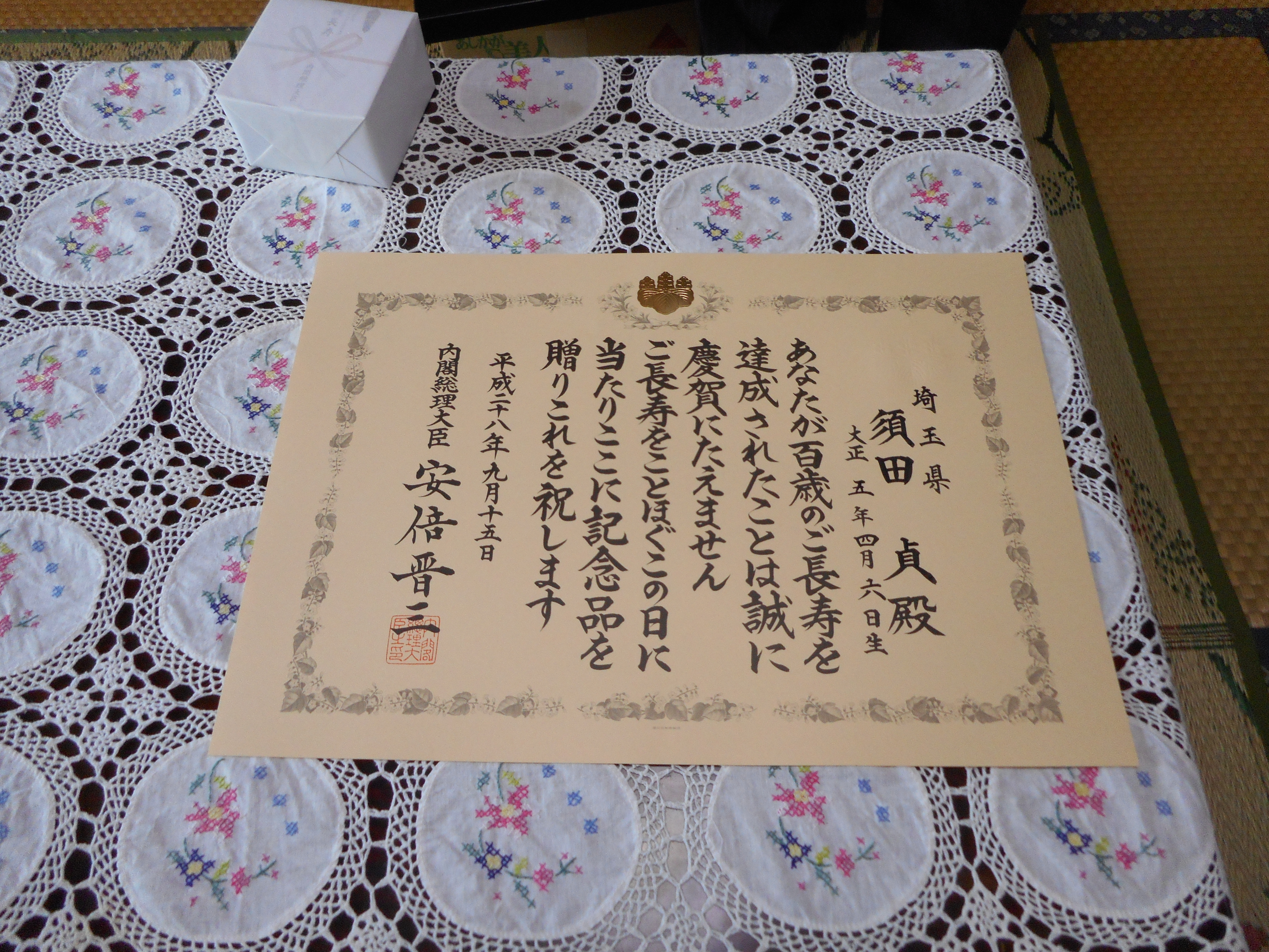 安倍晋三内閣総理大臣からのお祝いの書状と銀杯がおばあ様に手渡され