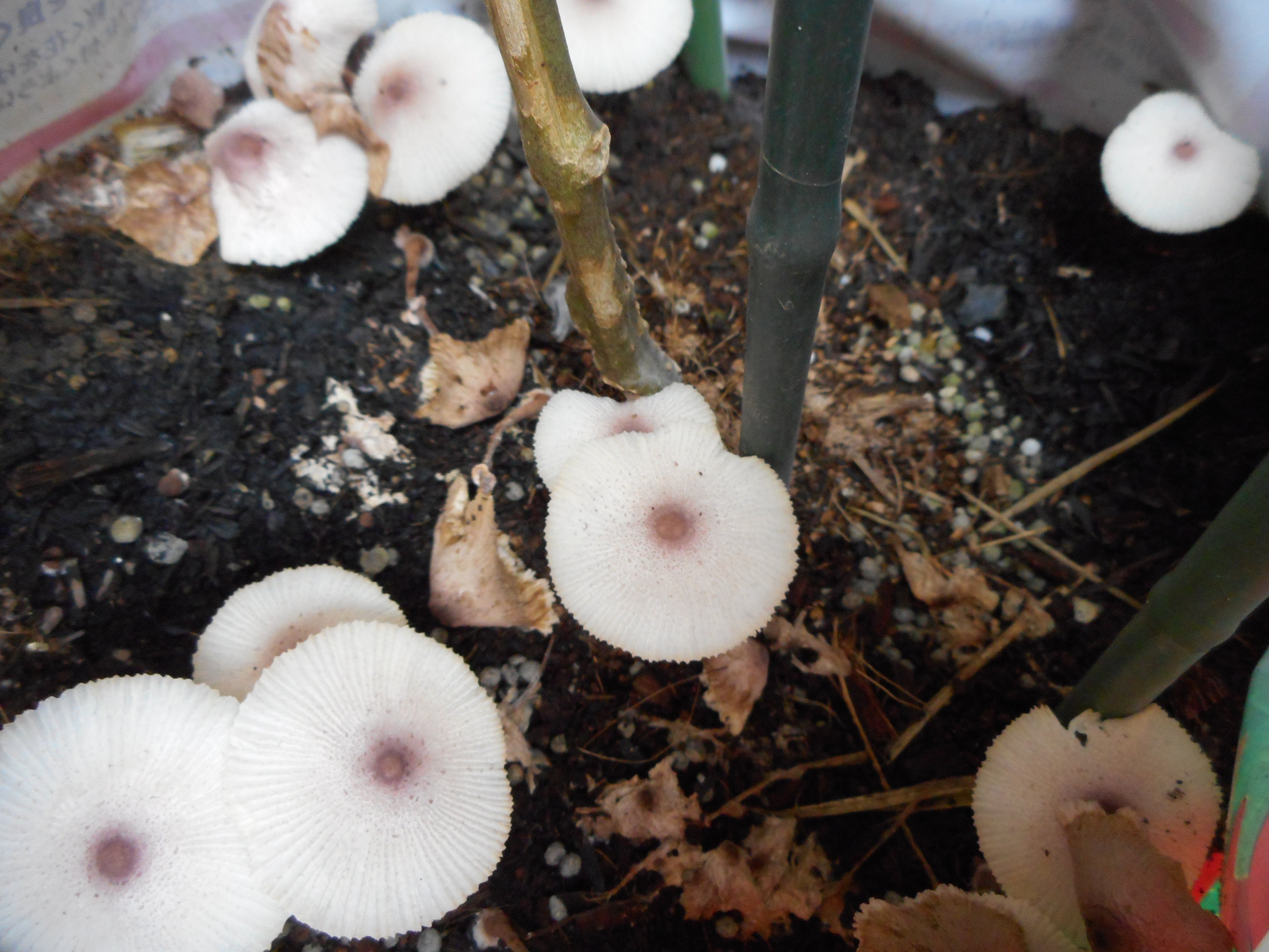 植込みの下にキノコが出ています。白いかわいいキノコですが