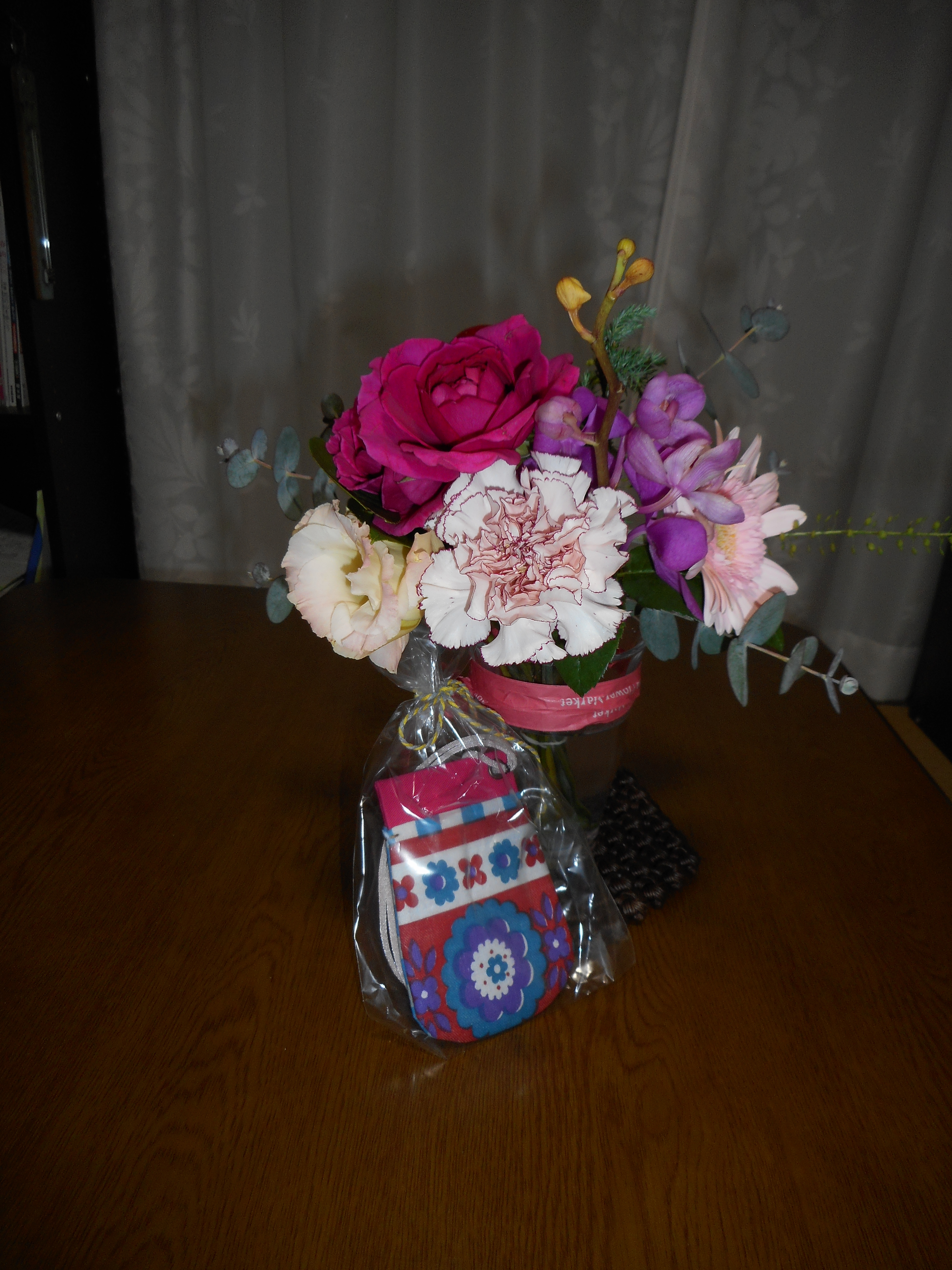 前から欲しかったスイカ入れ(手作り)や孫からのプレゼントのお花をもらい