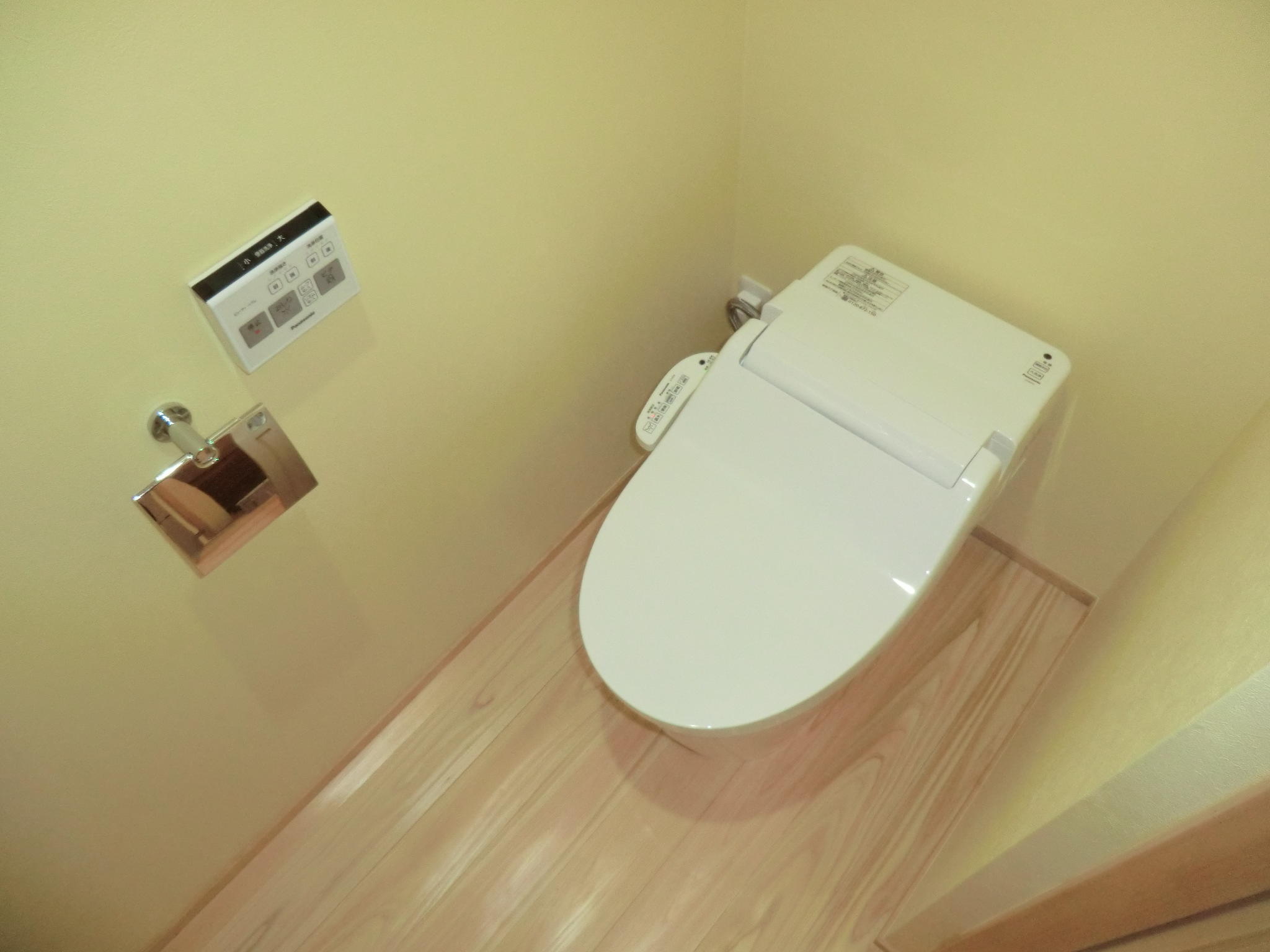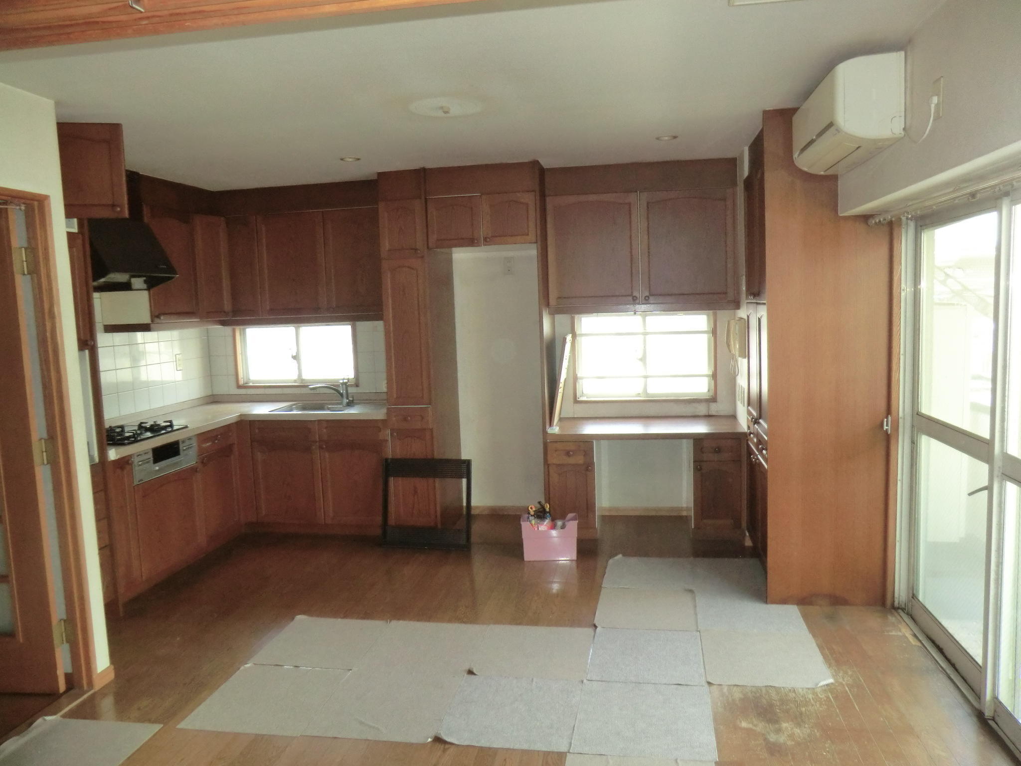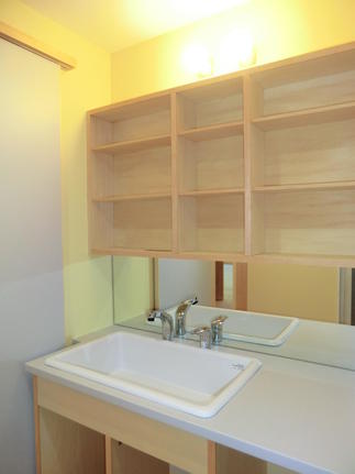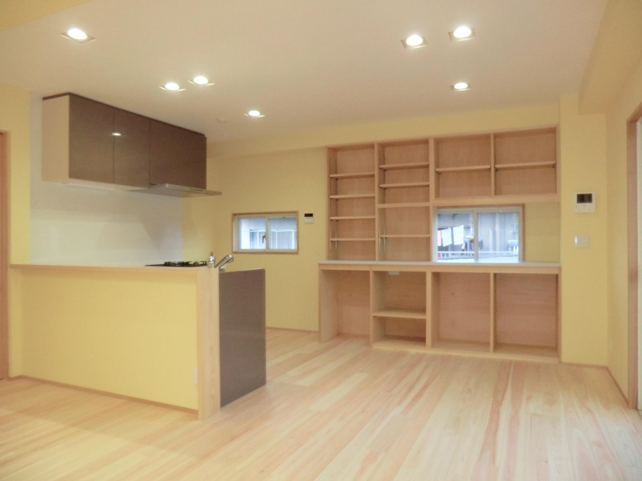 床材はヒノキ、カウンターはスギで仕上げています。キッチン・洗面の棚はお施主様のご要望の高さに合わせて造作しました。