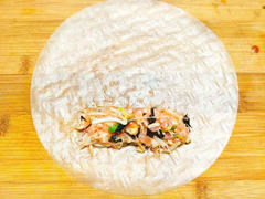 ⑥ 手前から少し巻き、具を押さえてライスペーパーをぎゅっと手前から巻き込み、左右を内側に折りたたみ、空気を入れないようにして巻きます。