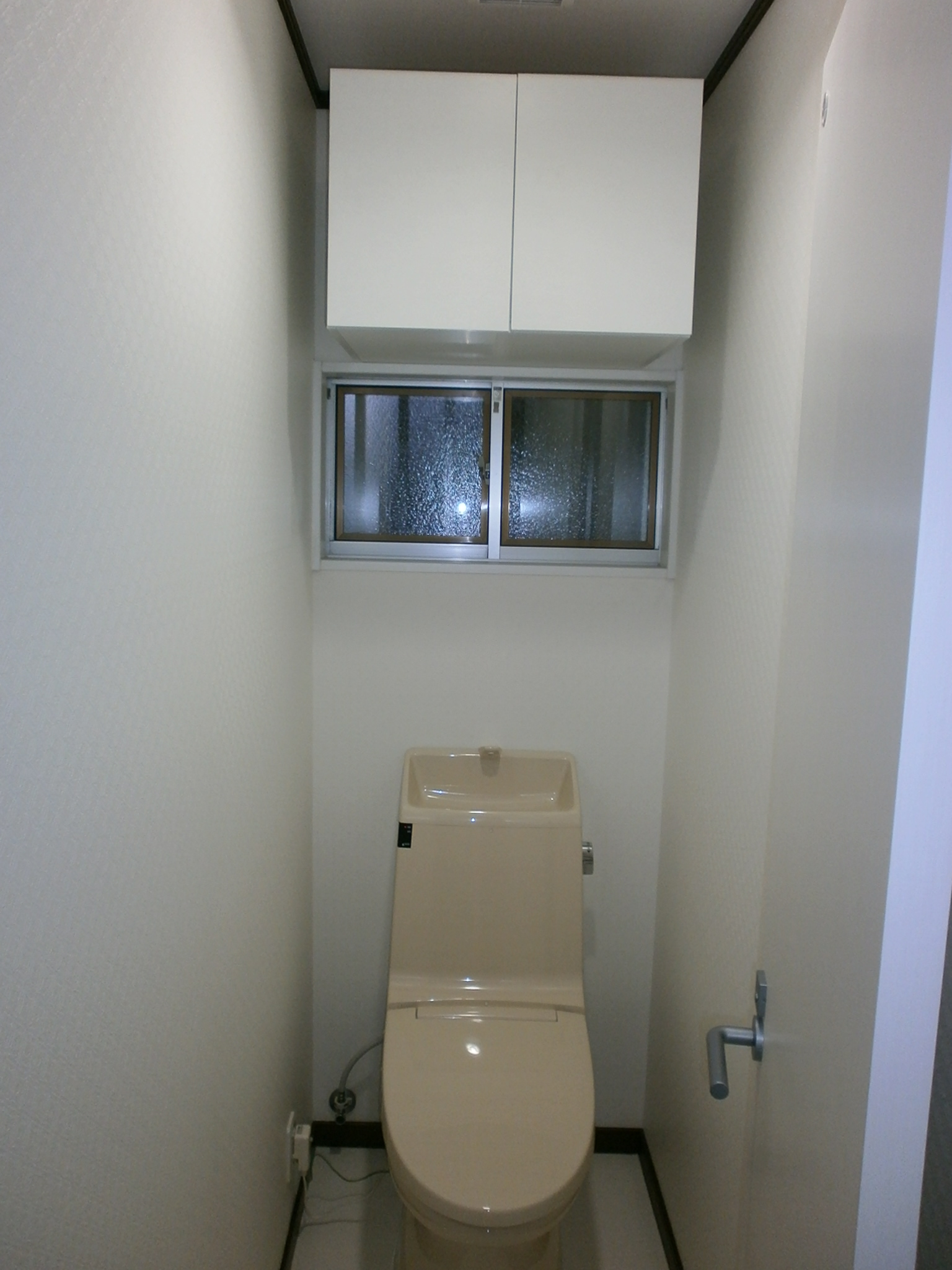 トイレ全体をリフォームしました。便器上部には新しく吊戸棚を取付け収納スペースを確保!