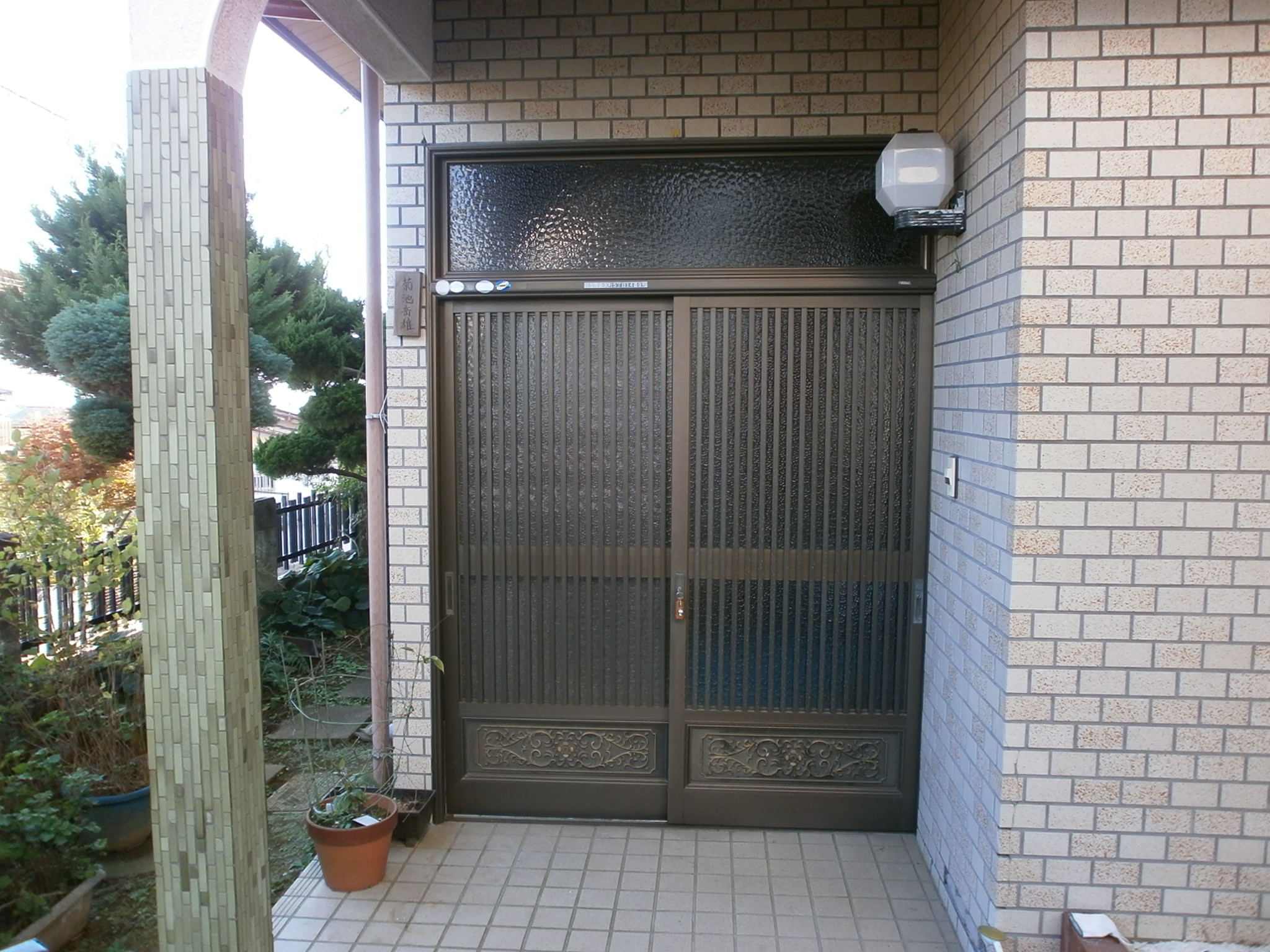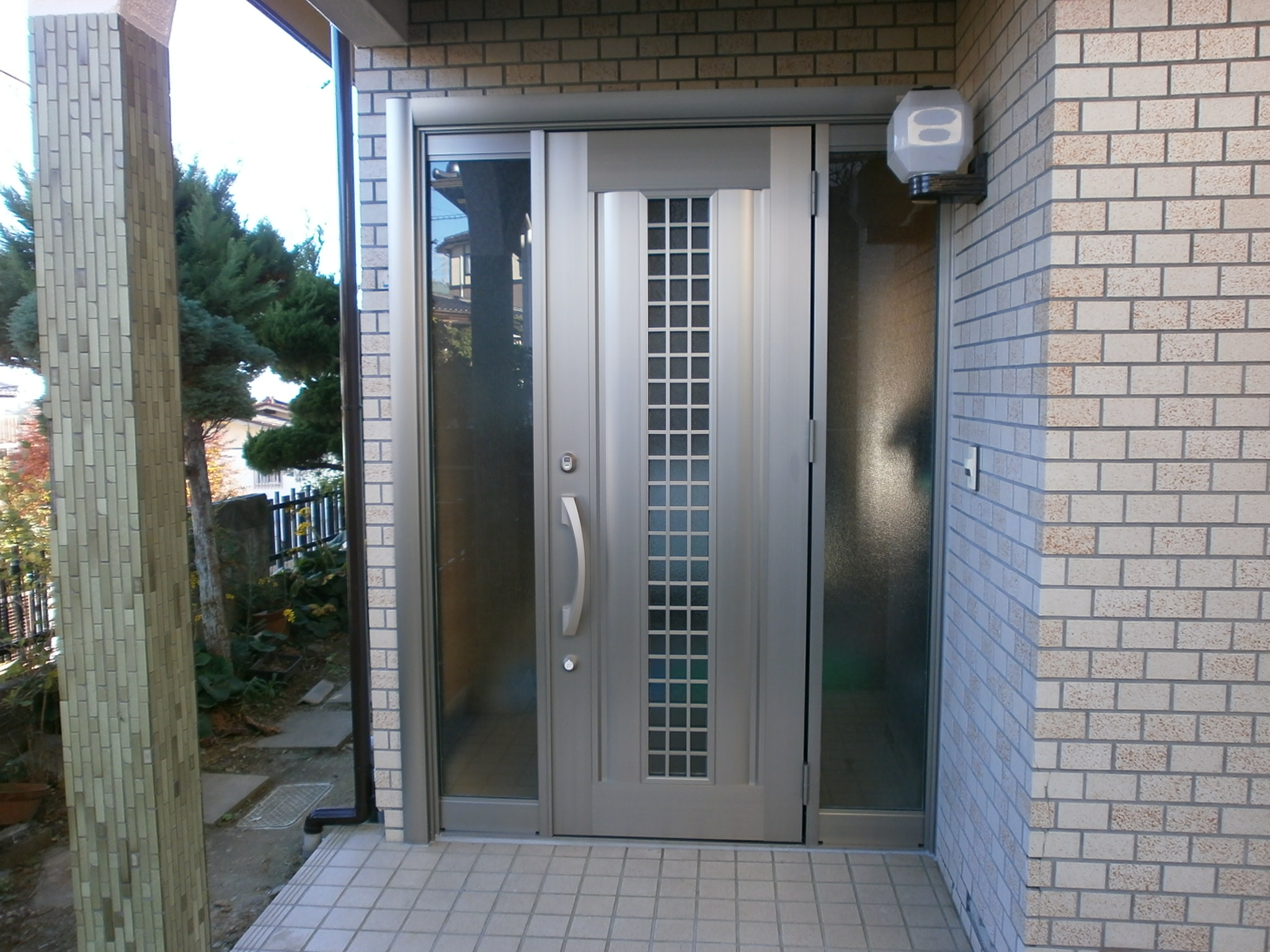 玄関ドアを引き戸から片開き戸へ入替ました。ドア両脇はガラスが入っており多くの光を取り込めます。