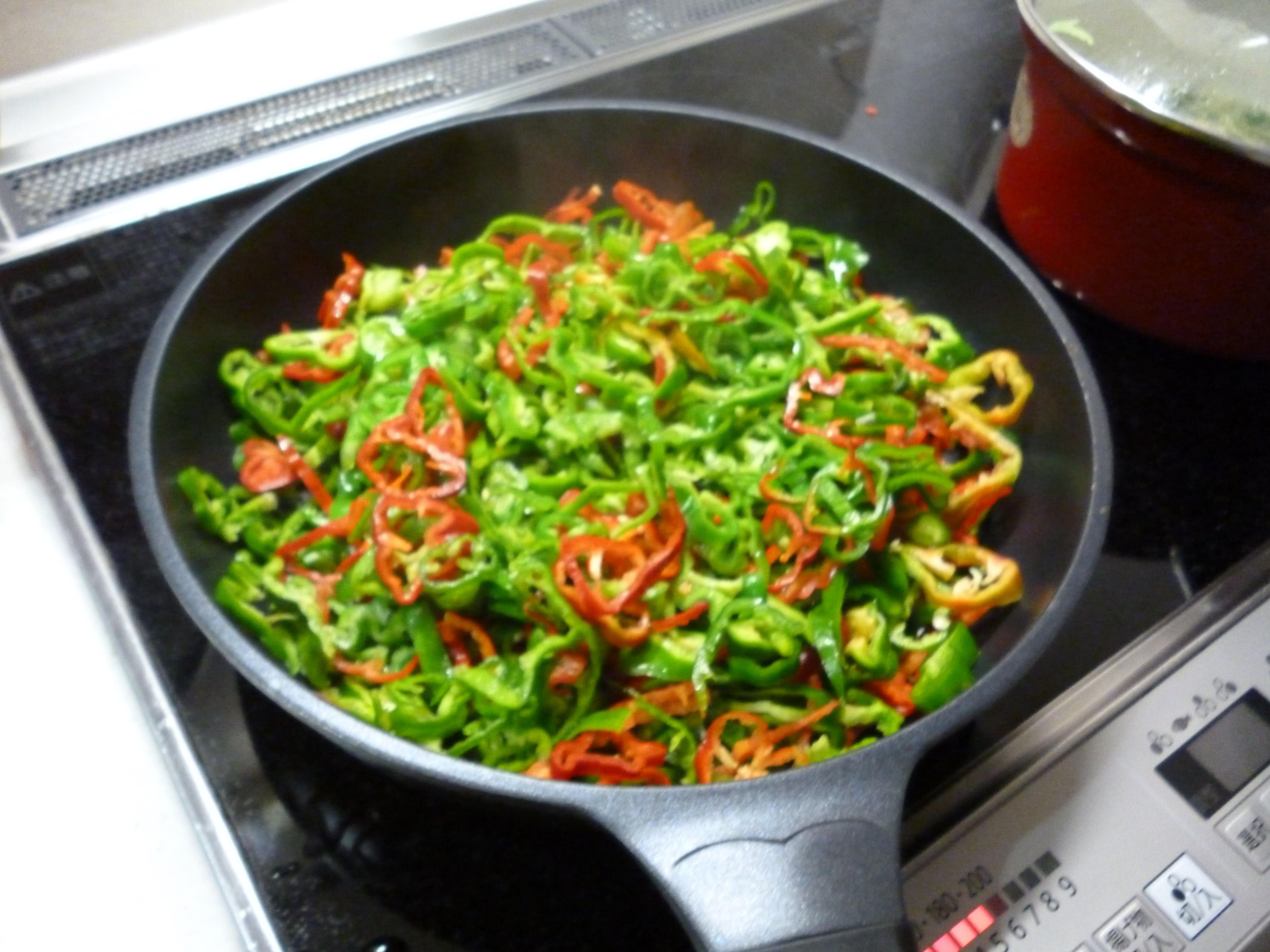 フライパンにいっぱいあったピーマンも炒めるうちに半分ほどになってしまいました。
