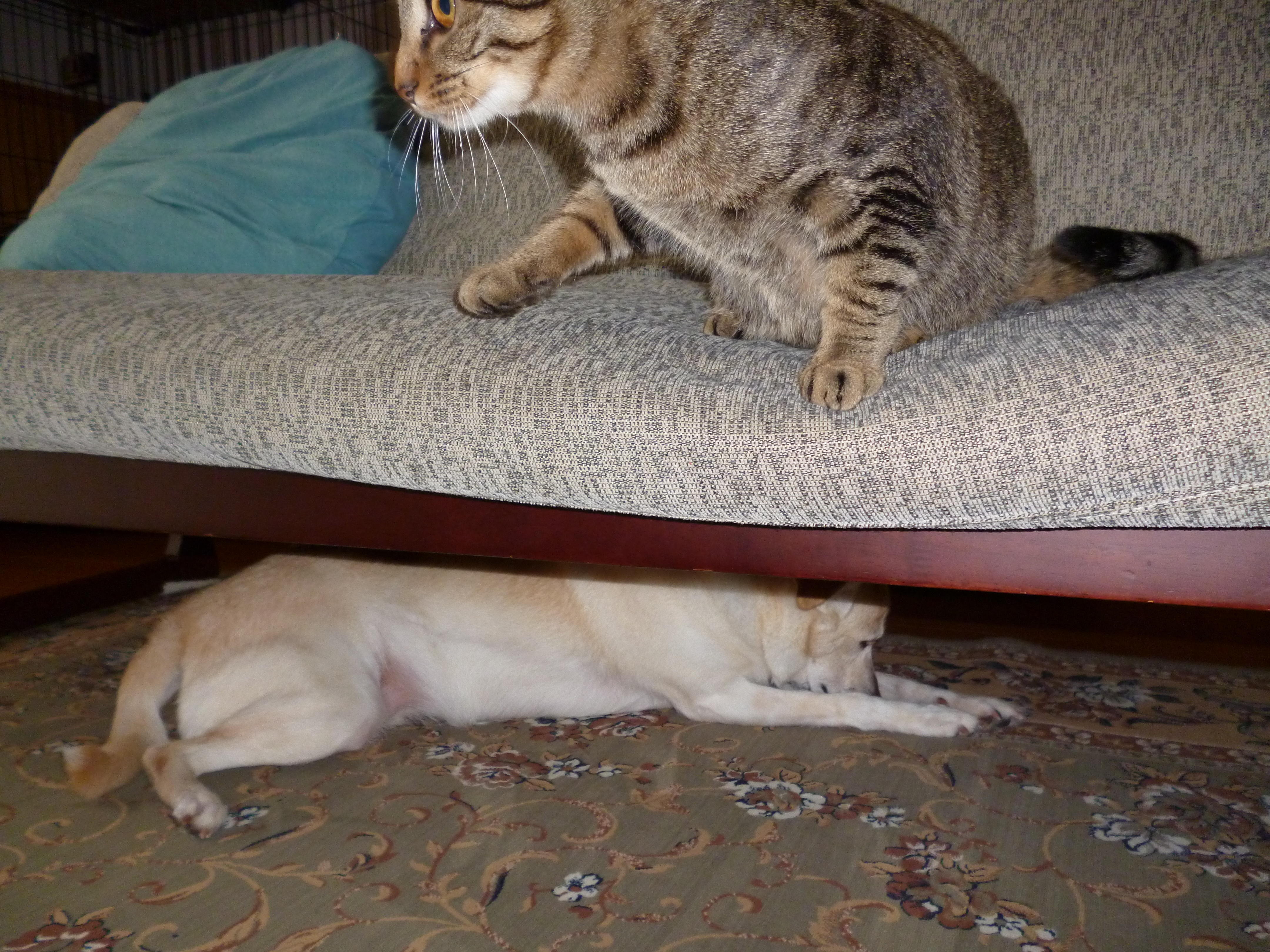 ソファーの上と下でまるで二段ベッドのようです(o^―^o)ニコ