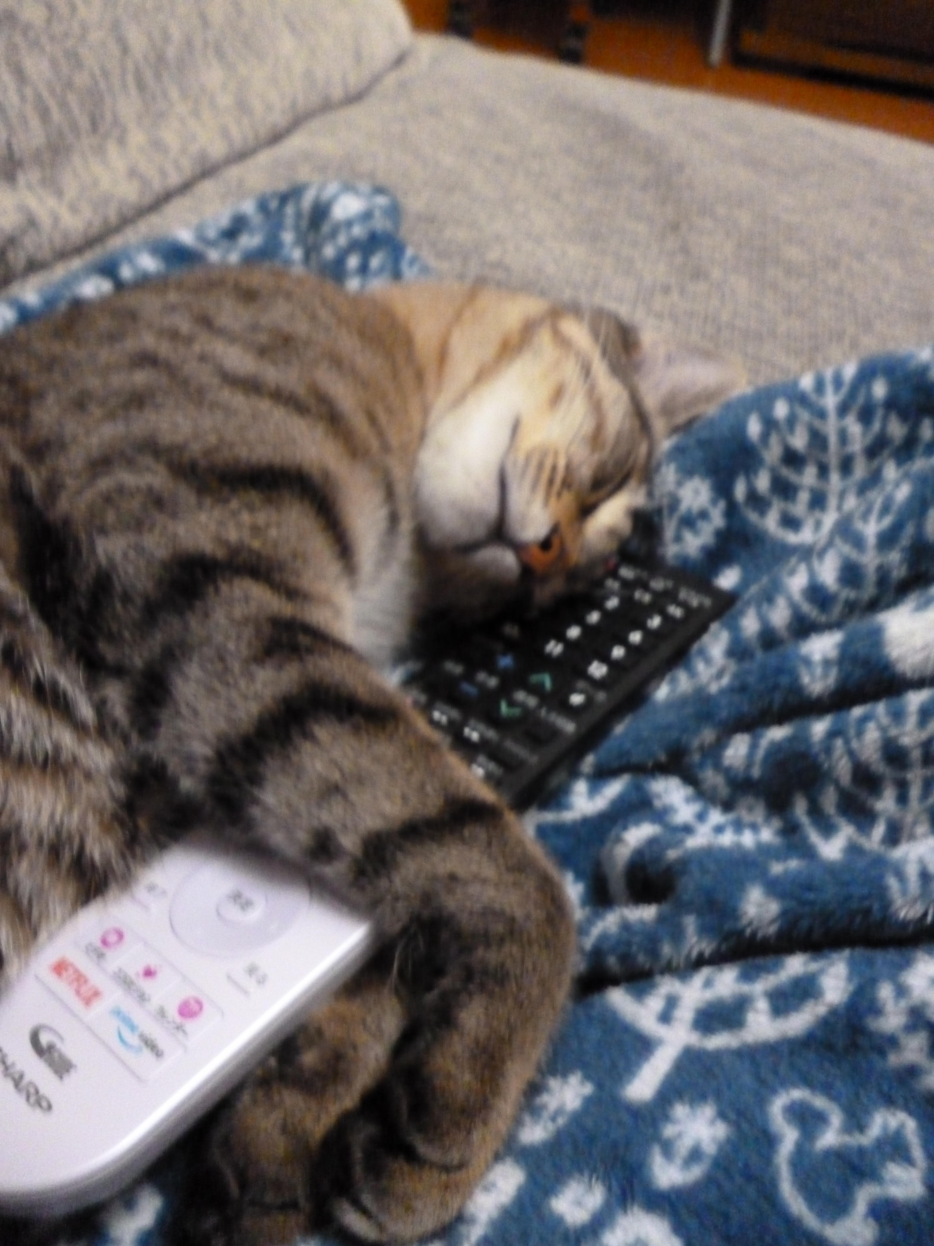 なぜかリモコンを大事そうに抱えて眠る猫ちゃん。