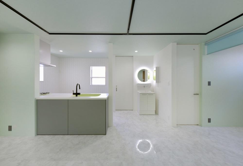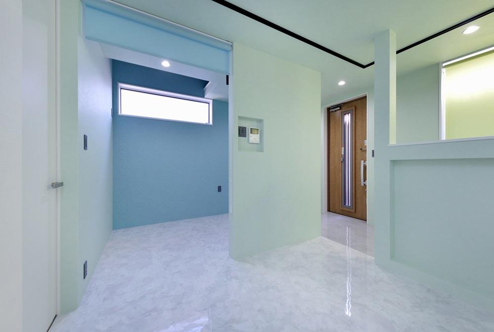 ワンフロアをグリーン系で統一、壁の色を変えてグルーピングされています。