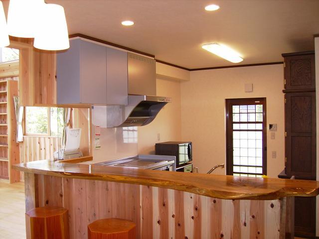 地元県産材をふんだんに使った内部の仕上げと、明るく使い易い対面キッチンに、ご満足いただけています。晩酌がすきなだんな様は、ハリモミのカウンターで一杯やりながら、「お店で飲んでいるみたい」とお喜びです。