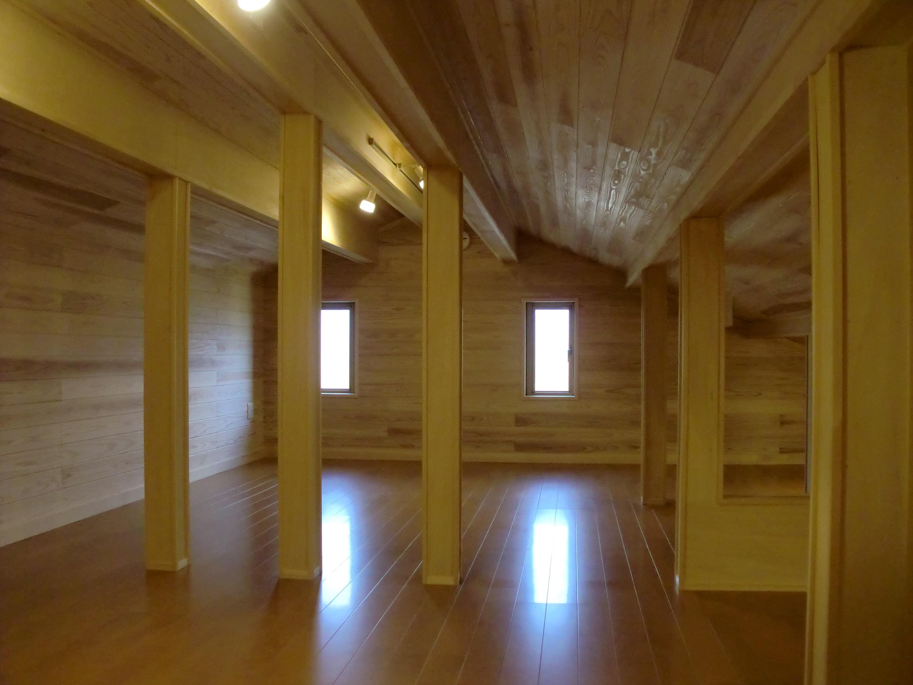同居家族が増えるにあたって、部屋数を増やすことに。平屋建ての天井裏を利用し、小屋裏部屋を作りました。木の温もりを感じられる杉板を天井・壁に使用しました。プライバシーにも考慮し、遮音マットをフローリングの下に敷き込むことで、足音も気になりません。