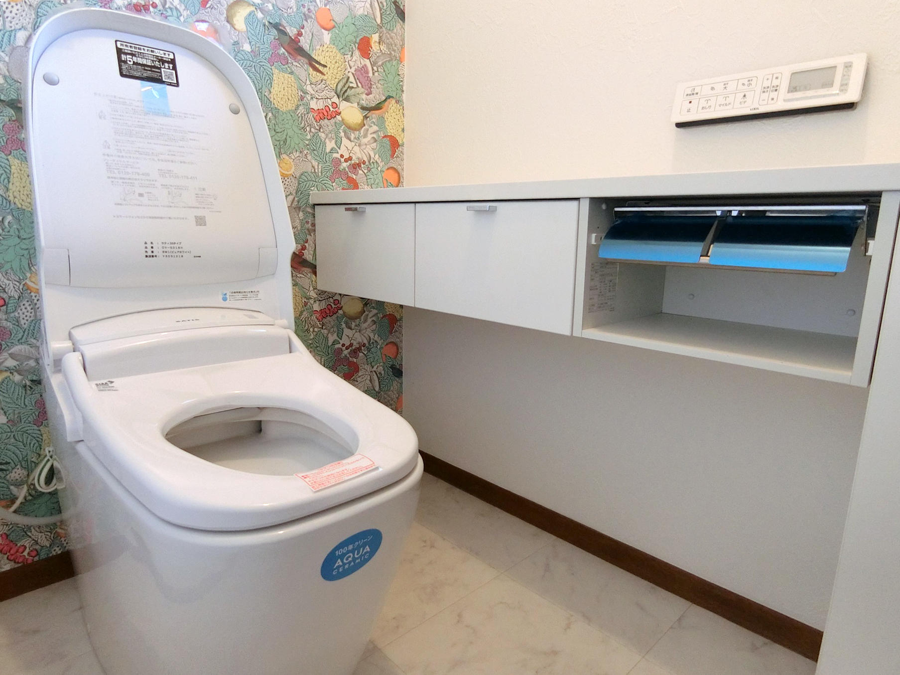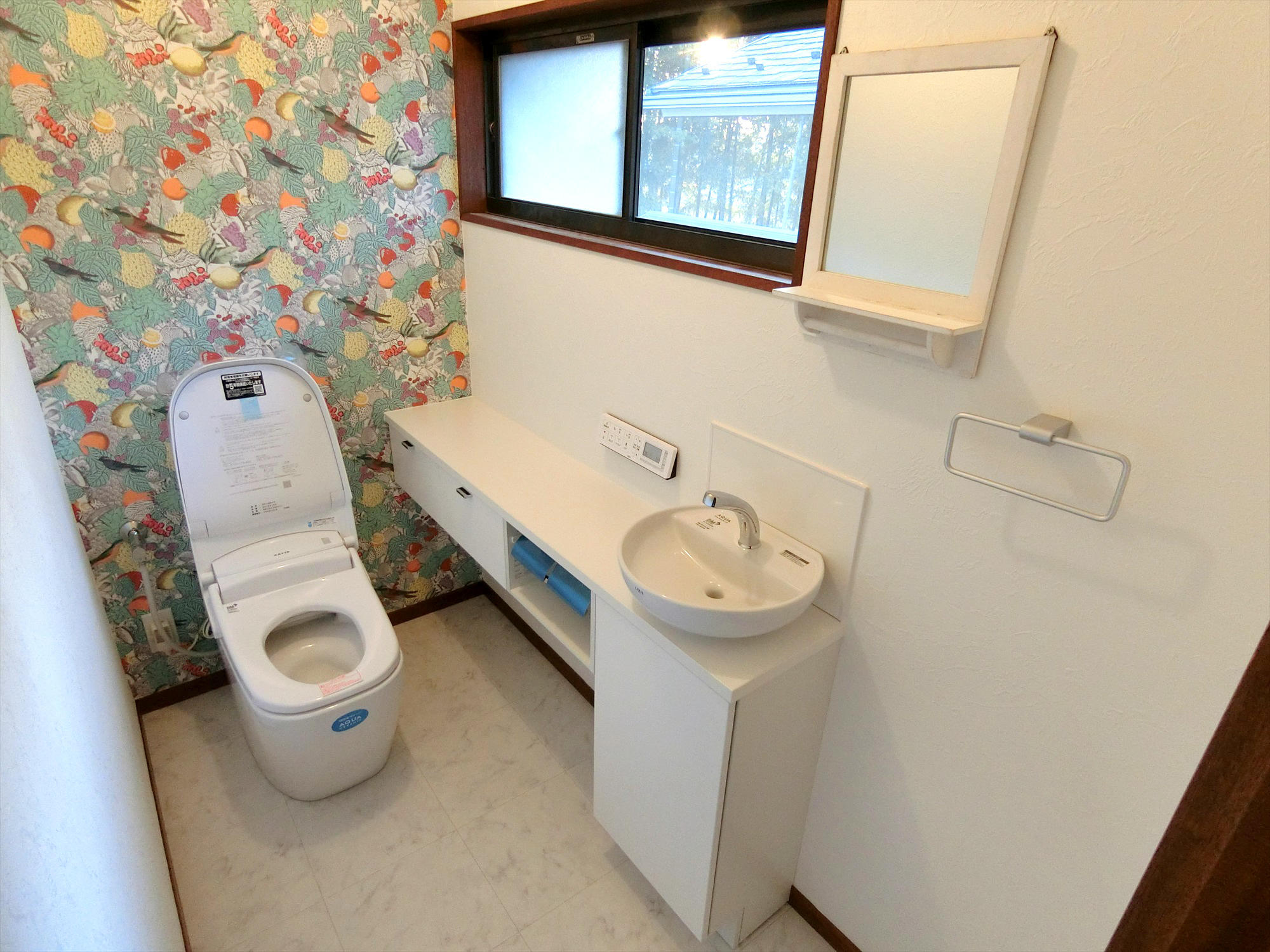 巾木など既存部分を利用し費用をおさえつつ、アクセントクロスやトイレ本体でお部屋の雰囲気をおしゃれに。元々あった洗面台を手洗いキャビネットにすることで、空間を広く取ることが出来ました。