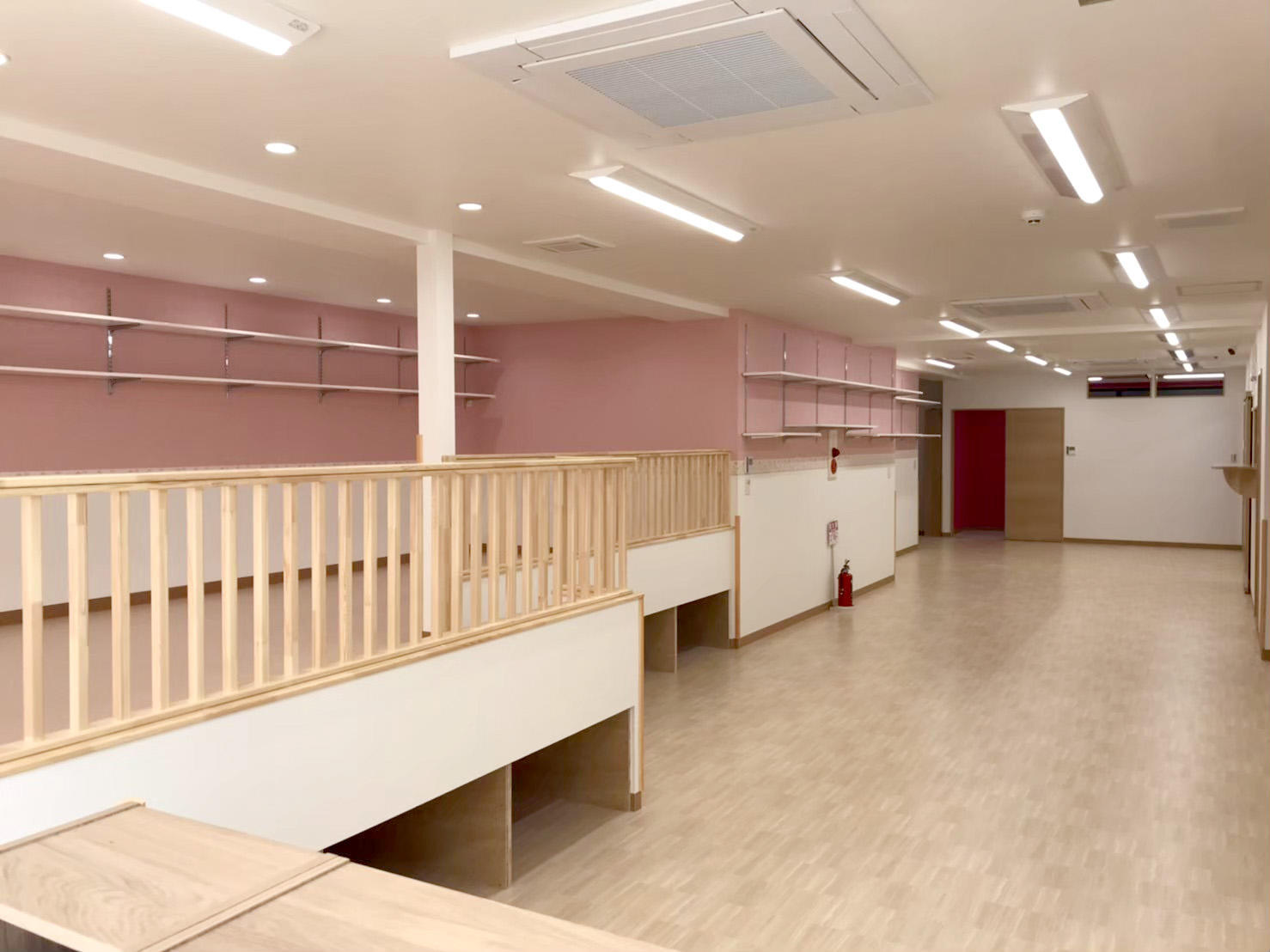 既存スケルトンからの保育園施設の設備、内装工事になります。 明るい色合いの壁紙と、ナチュラルな木の風合いのある家具を採用しました。 予算を抑えつつも必要な機器を備えた、利用しやすい施設となりました。