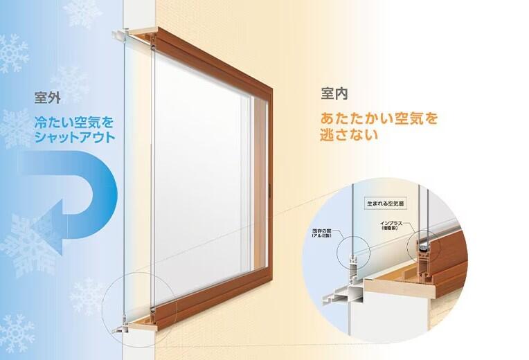 インプラスとは「内窓」のことです。既存の窓だけでは、外からの冷気が窓から入ってきます。内窓を取り付けると外の冷気の侵入を防ぎ、エアコンで暖められた室内の空気を逃げにくくします。窓と窓の間の空気の「層」が断熱材となり断熱効果、防音効果、防犯効果があります。