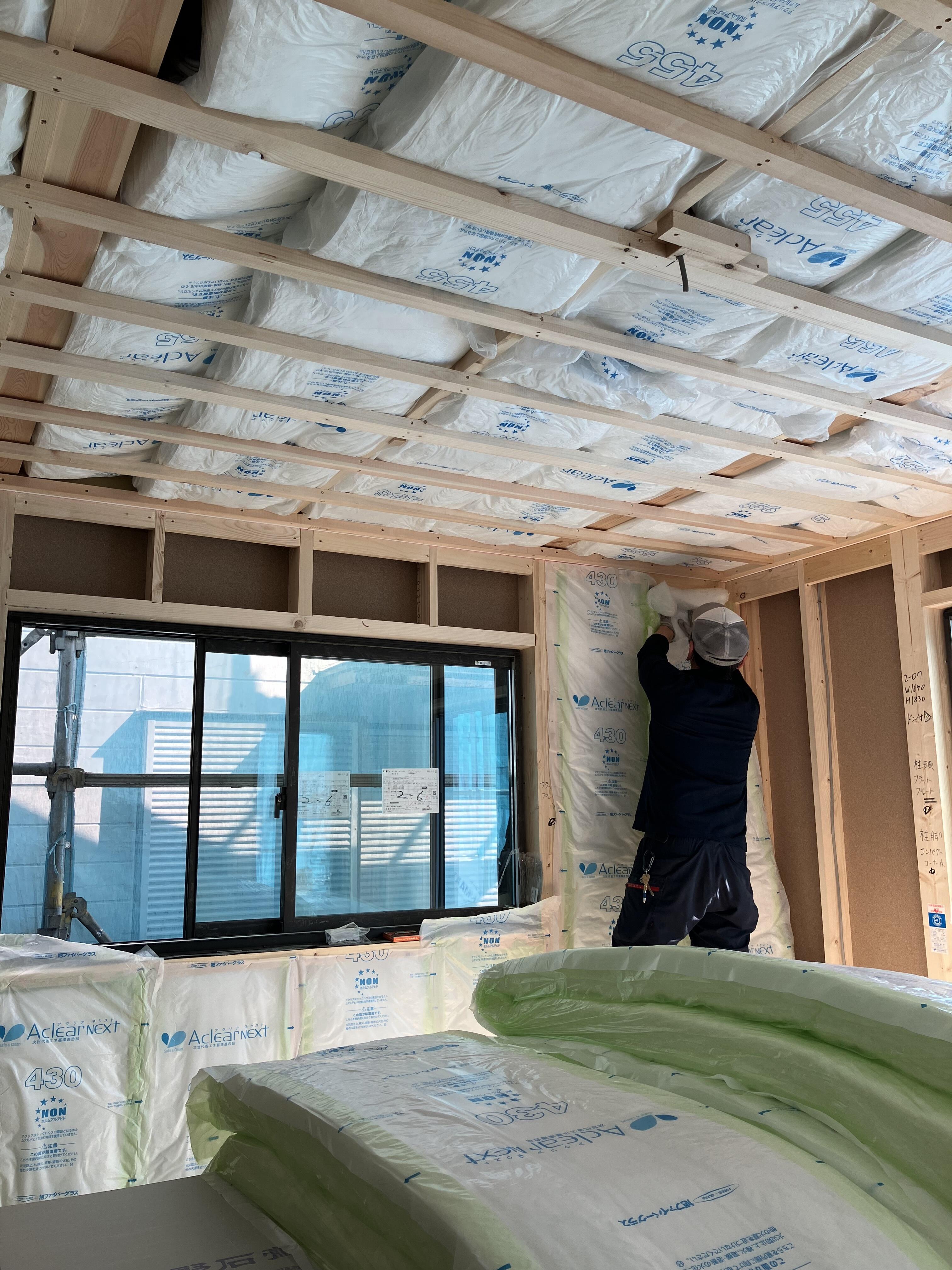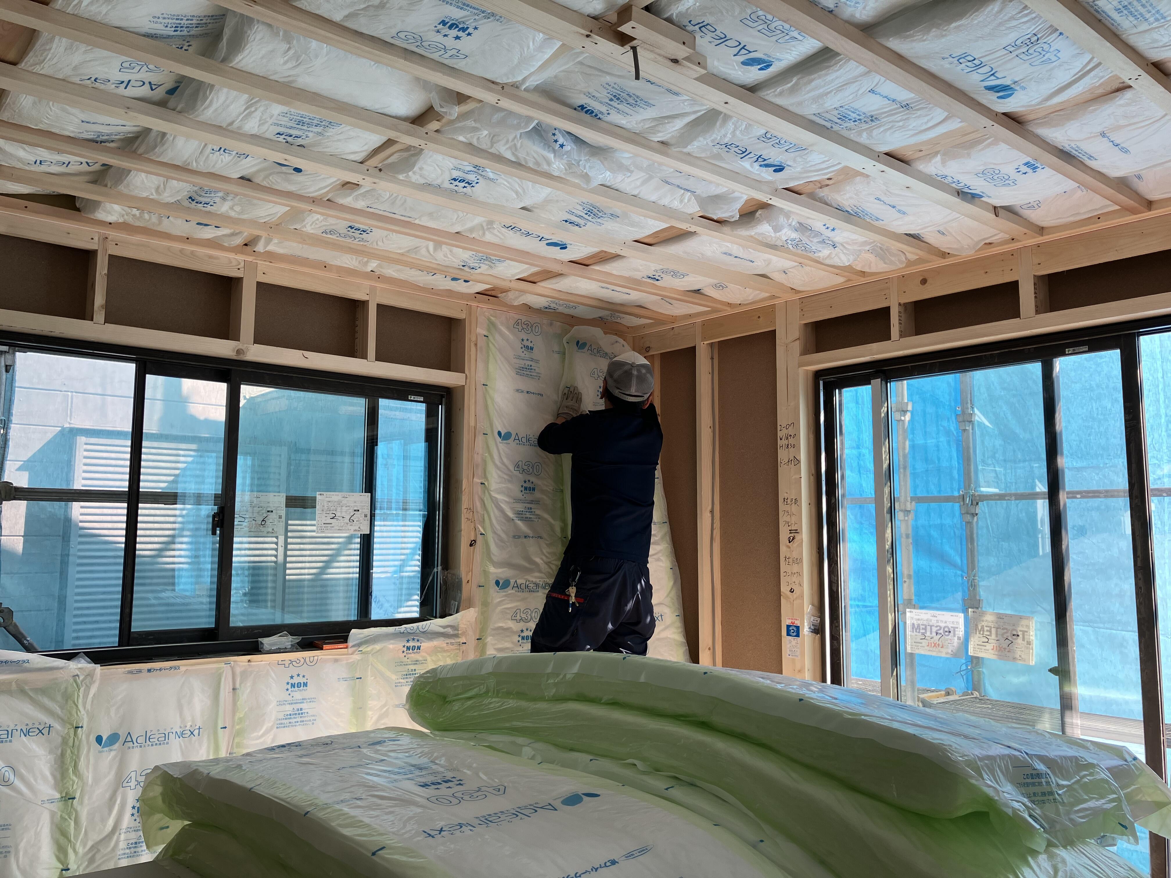 現在、大工さんが隙間が出来ないよう、グラスウールという断熱材をしっかりと入れている所です。