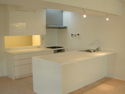 部屋全体が白を基調としており清潔な印象です。造り付け収納が充実しており、間接照明が広さ温かさを演出します。