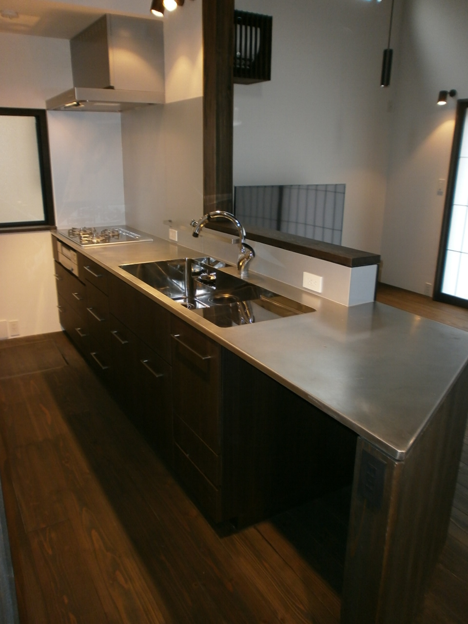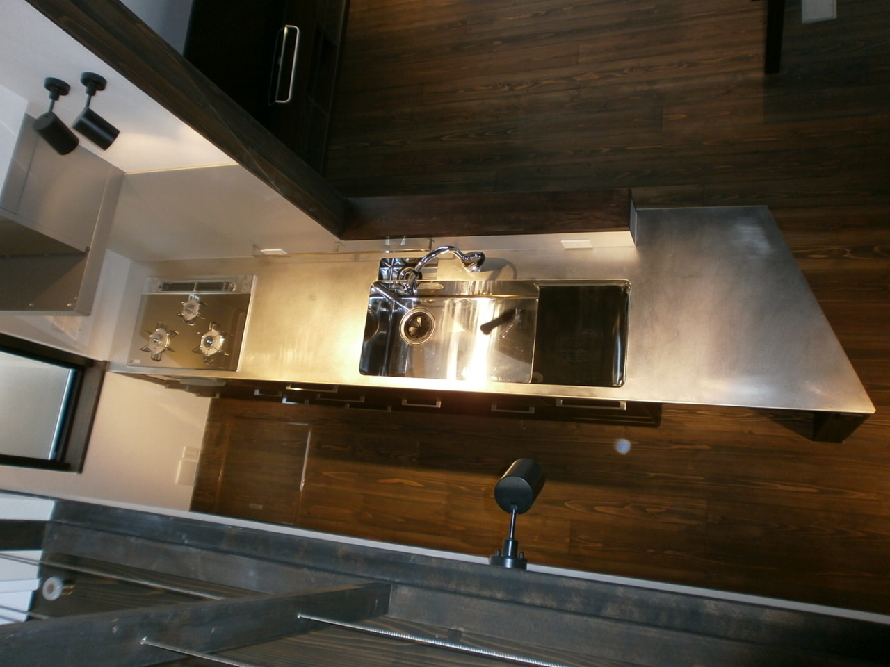シンク内部は鏡面磨きのステン、作業スペースはヘアライン仕上げのステン。