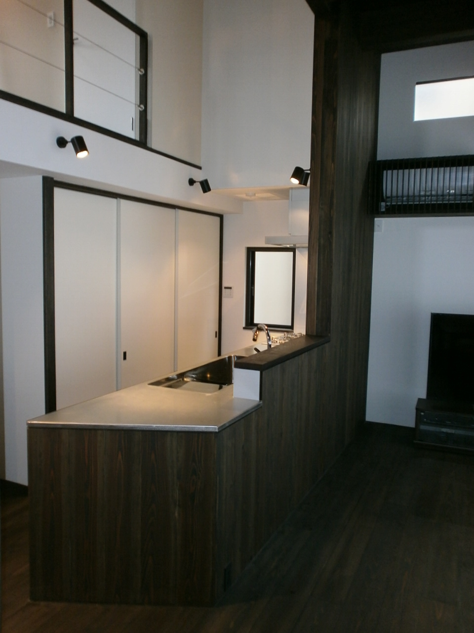 吹き抜けの上から見るとキッチンカウンターのフォルムが、シックな杉のフローリングをバックにシャープな形を浮かび上がらせています。